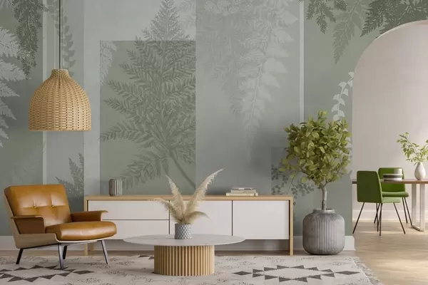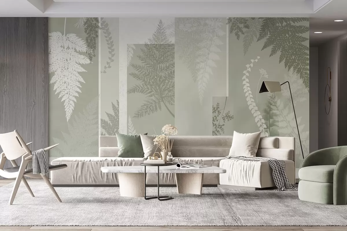 Fototapety Listy kapradí v zelené a bílé barvě, uspořádané do svislých pruhů, vytvářející botanický a minimalistický potisk, jemné a tlumené barvy Č. w09007v2