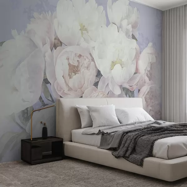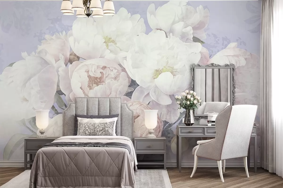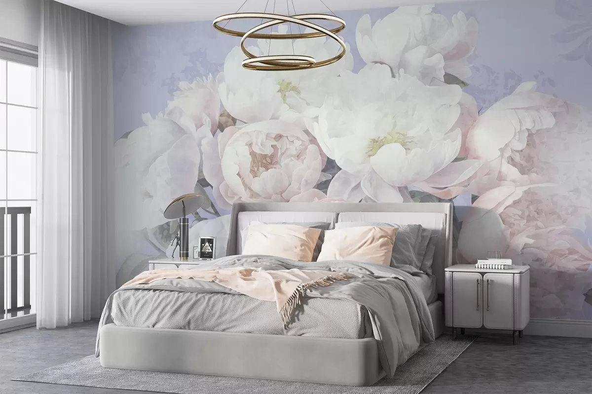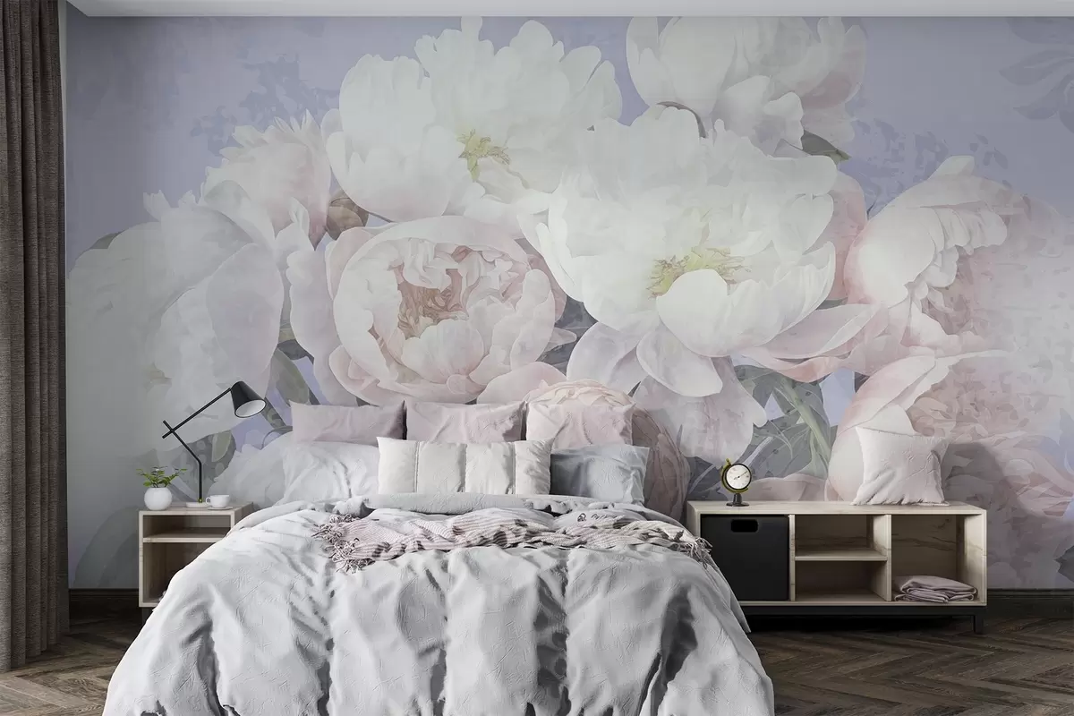 Fototapety Texturované abstraktní broskvové a bílé pivoňky se zelenými listy, světlé pozadí, měkké a jemné barvy, vintage styl Č. w09008v1