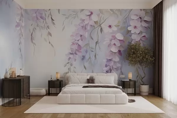 Fototapety Květy vistárie s lila okvětními lístky a zelenými listy visícími z větví, jemné pastelové barvy, pastelové barevné pozadí Č. w09010