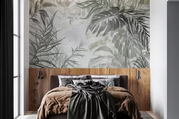 Fototapety Monstera a palmové listy v odstínech zelené a šedé, botanické, tropické listí, rostliny džungle, texturované pozadí Č. w09011