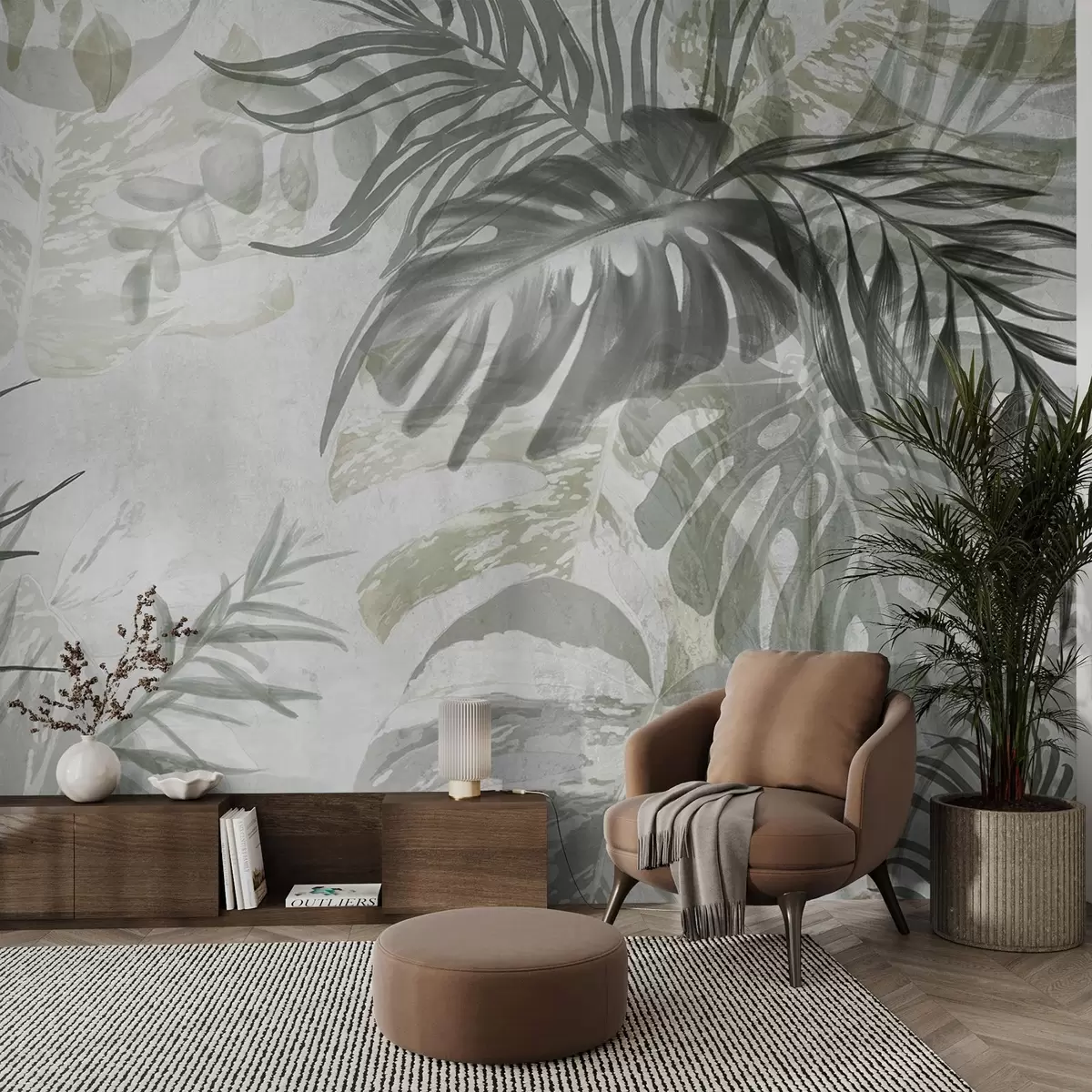 Fototapety Monstera a palmové listy v odstínech zelené a šedé, botanické, tropické listí, rostliny džungle, texturované pozadí Č. w09011