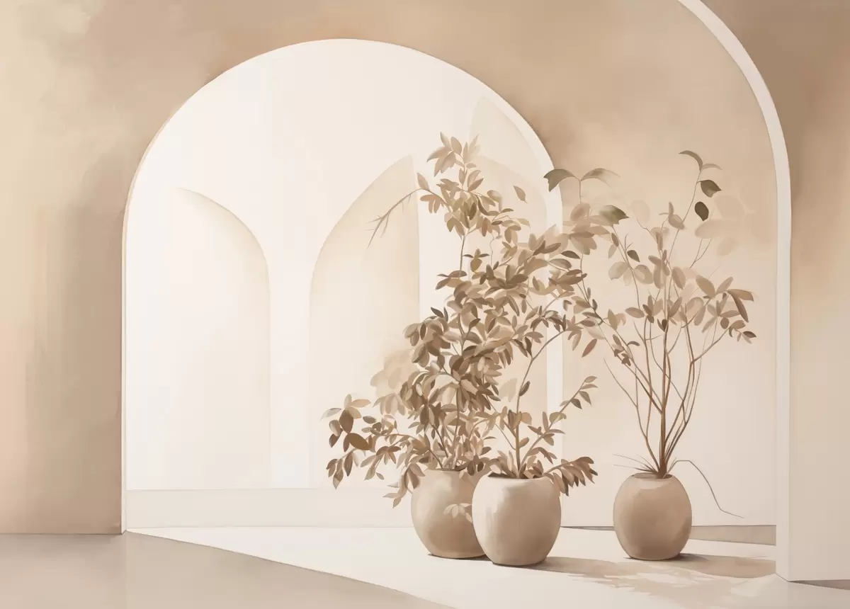 Fototapety Rostliny v květináčích v béžových tónech před abstraktními oblouky, minimalistický styl, elegantní a čisté, neutrální pozadí Č. w09013