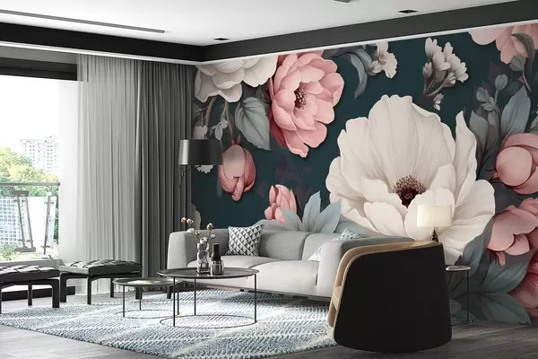 Fototapety Bílé a růžové pivoňky na tmavě modrém pozadí Č. w09017