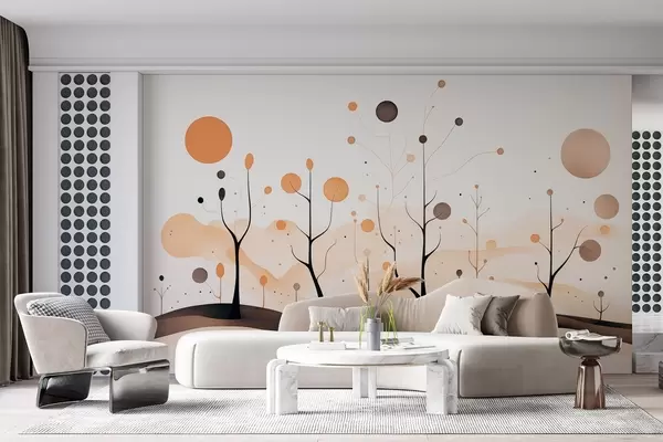 Fototapety Abstraktní stromy s koulemi a sluncem v béžovo-šedých tónech Č. w09043