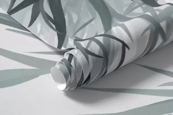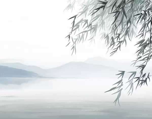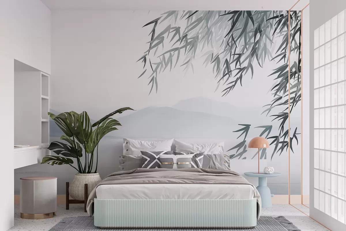 Fototapety Bambusové listy visící nad jezerem s horami v pozadí, jemné modré a bílé tóny, styl malby vymýváním tuší Č. w09048