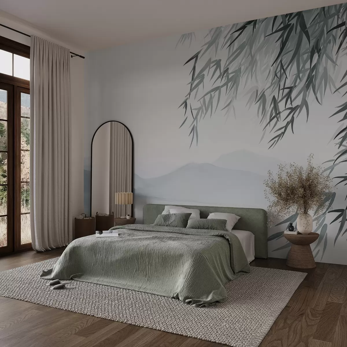Fototapety Bambusové listy visící nad jezerem s horami v pozadí, jemné modré a bílé tóny, styl malby vymýváním tuší Č. w09048