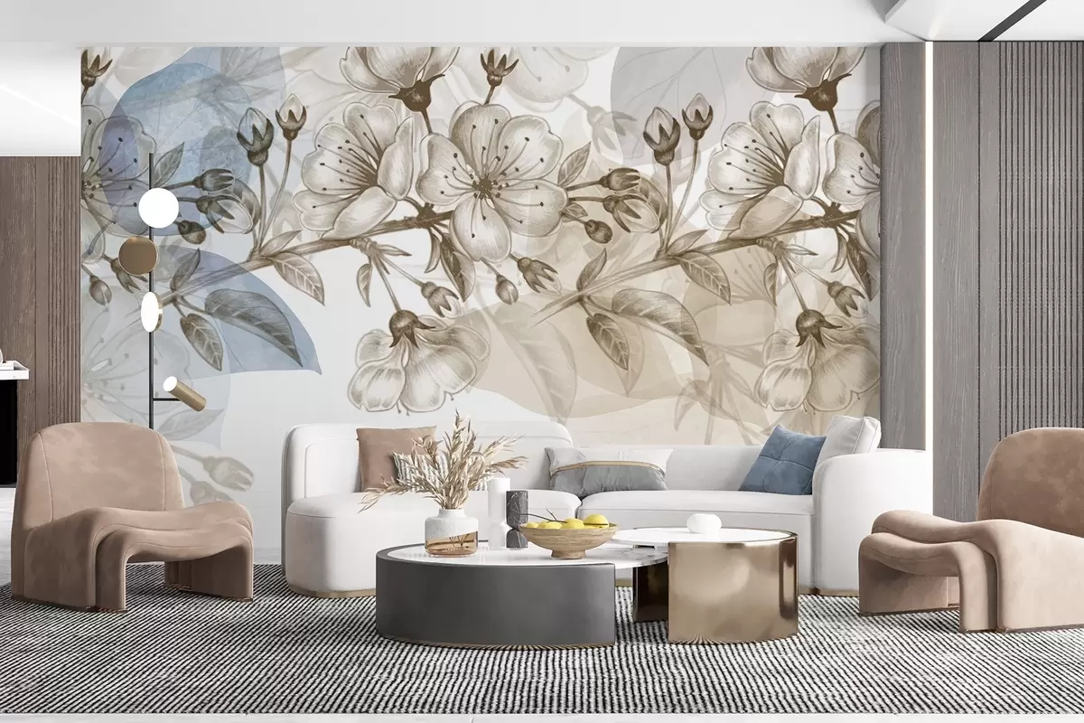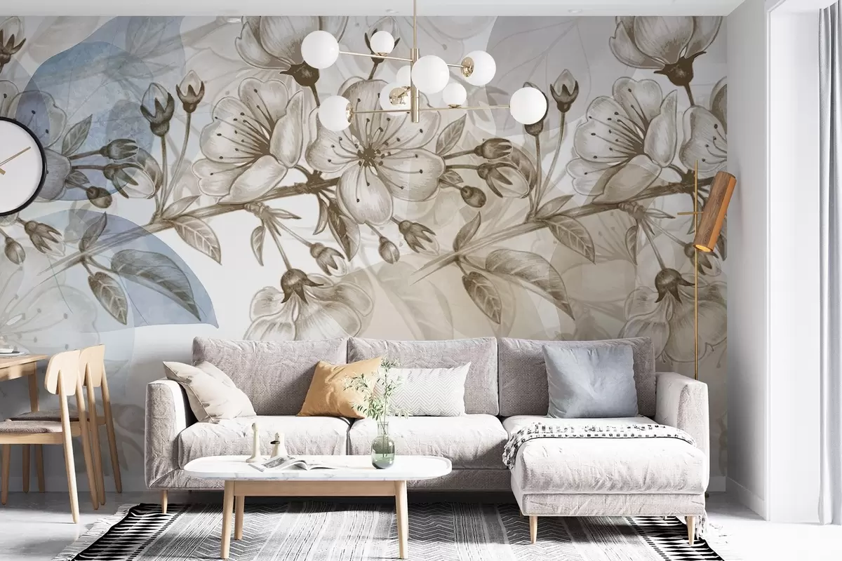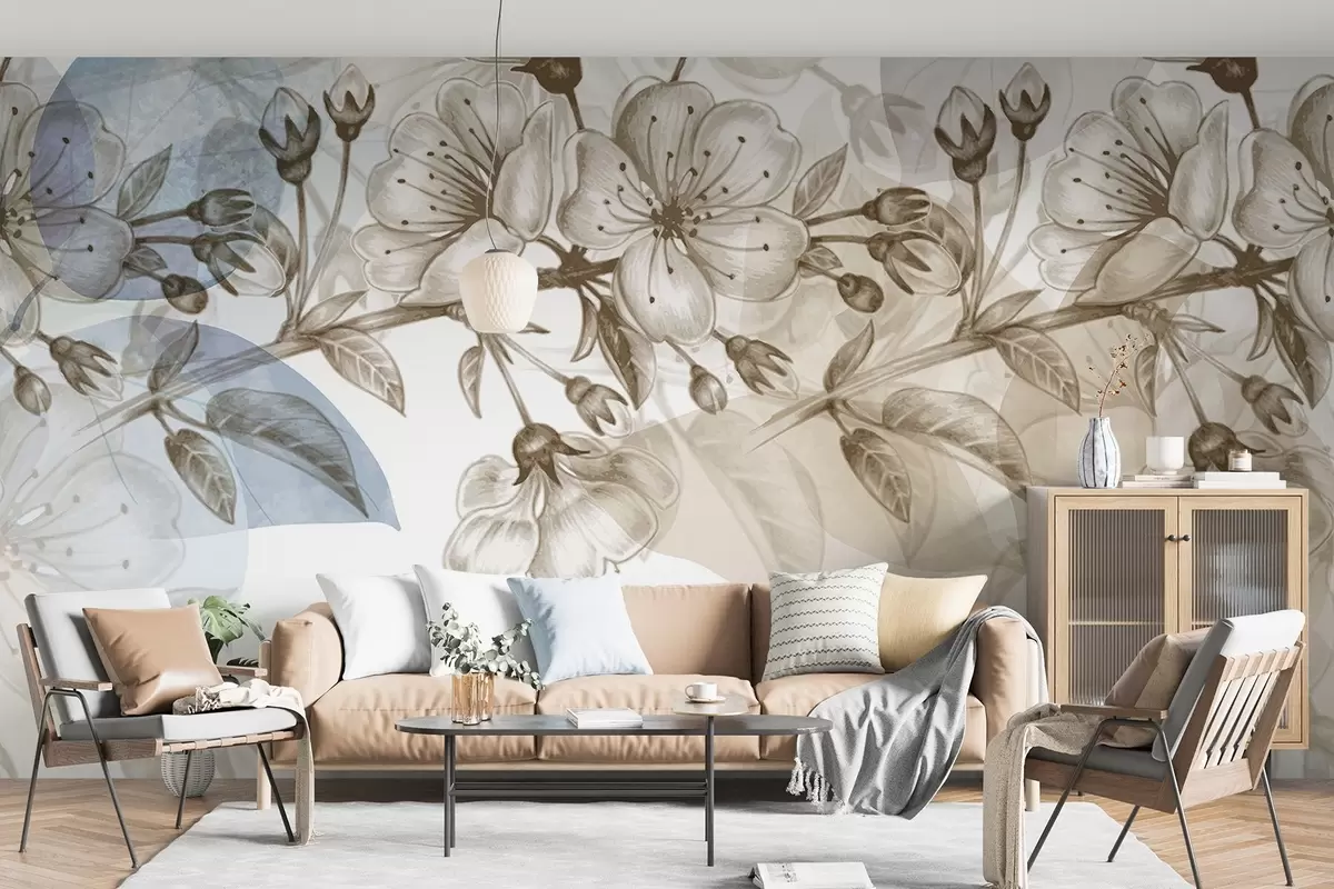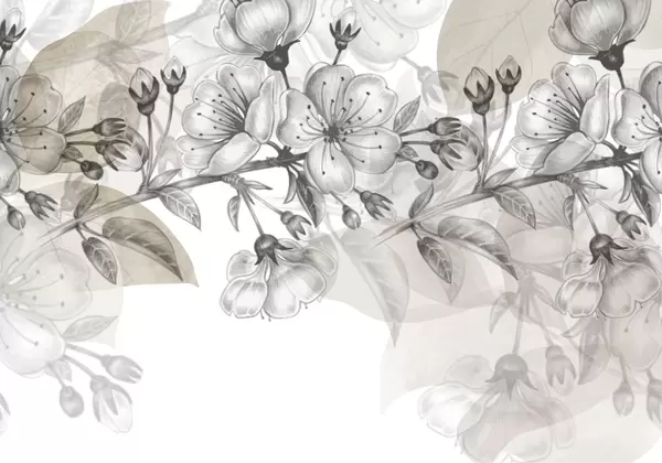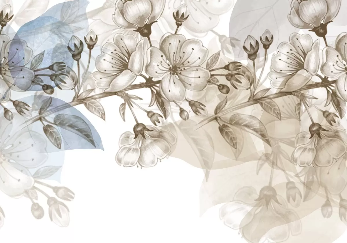 Fototapety Větev třešňového květu s květy a poupaty, sépiové tóny, jemné akvarelové pozadí s modrými a hnědými odstíny Č. w09051