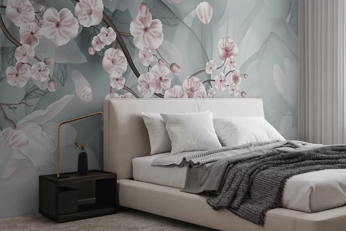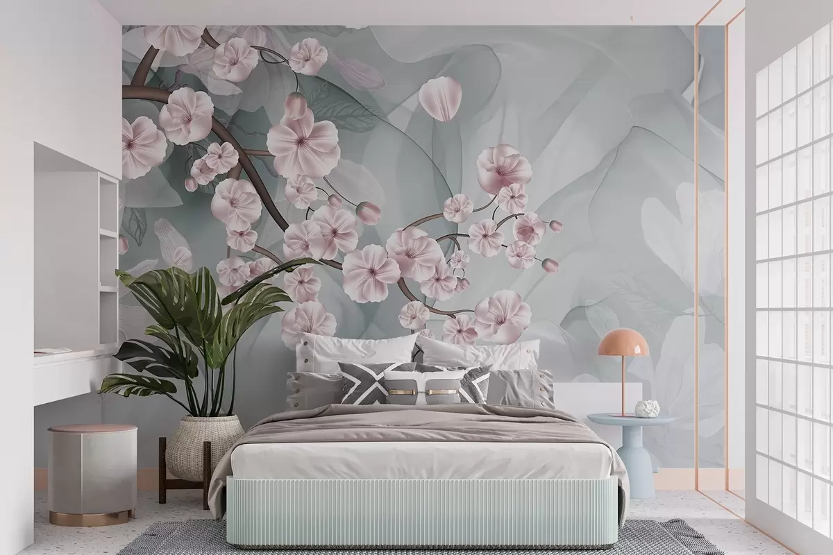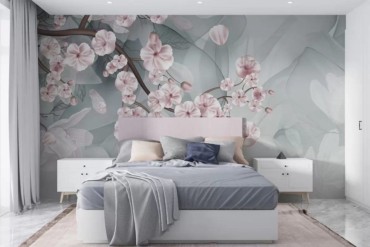 Fototapety Větve třešňových květů s růžovými květy a okvětními lístky, hnědé větve, abstraktní tlumené pozadí s efektem plynutí Č. w09054