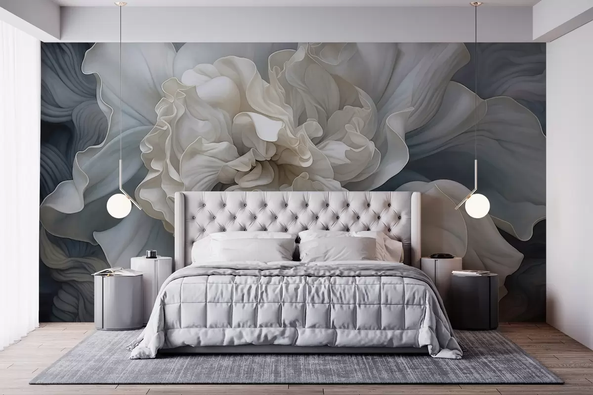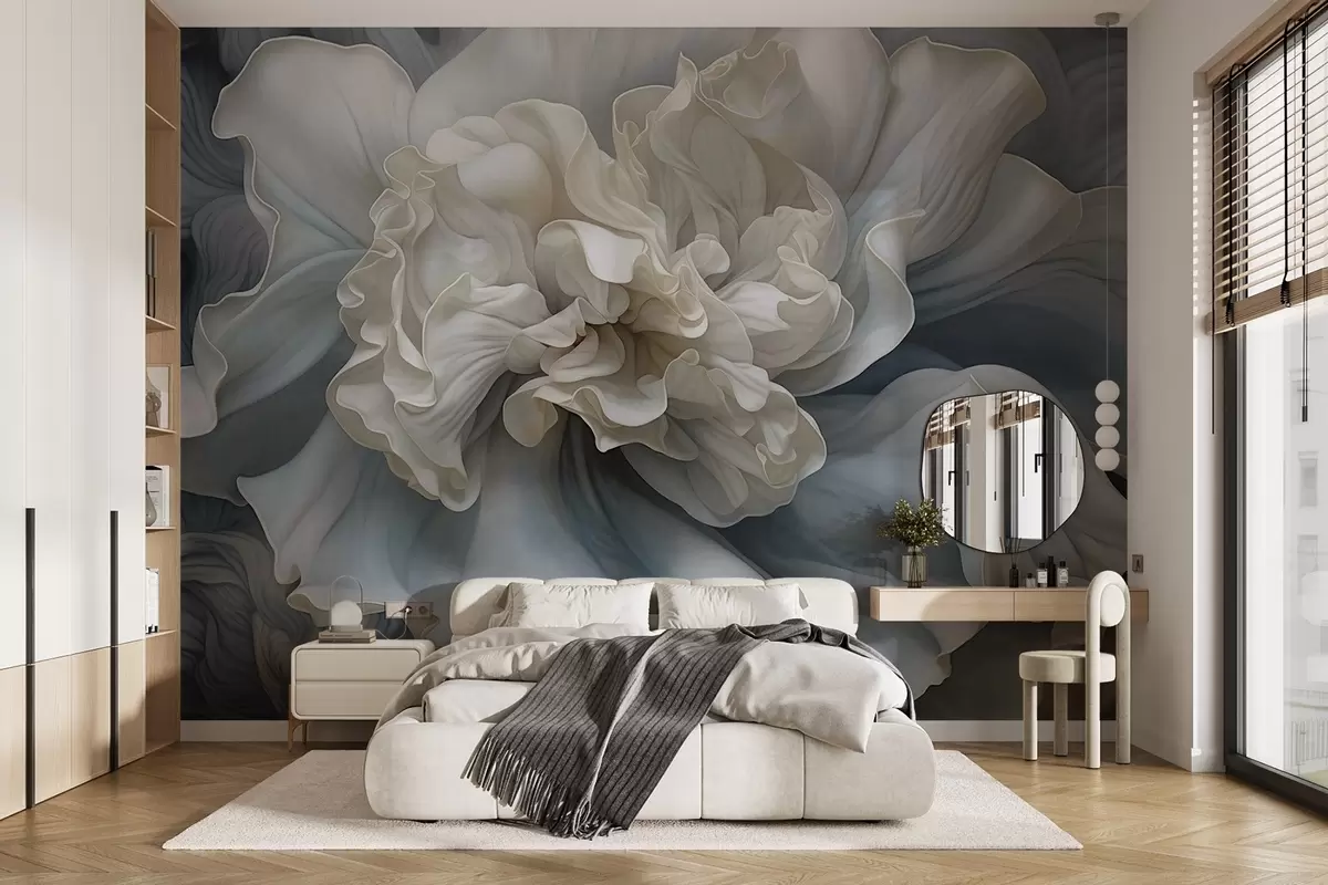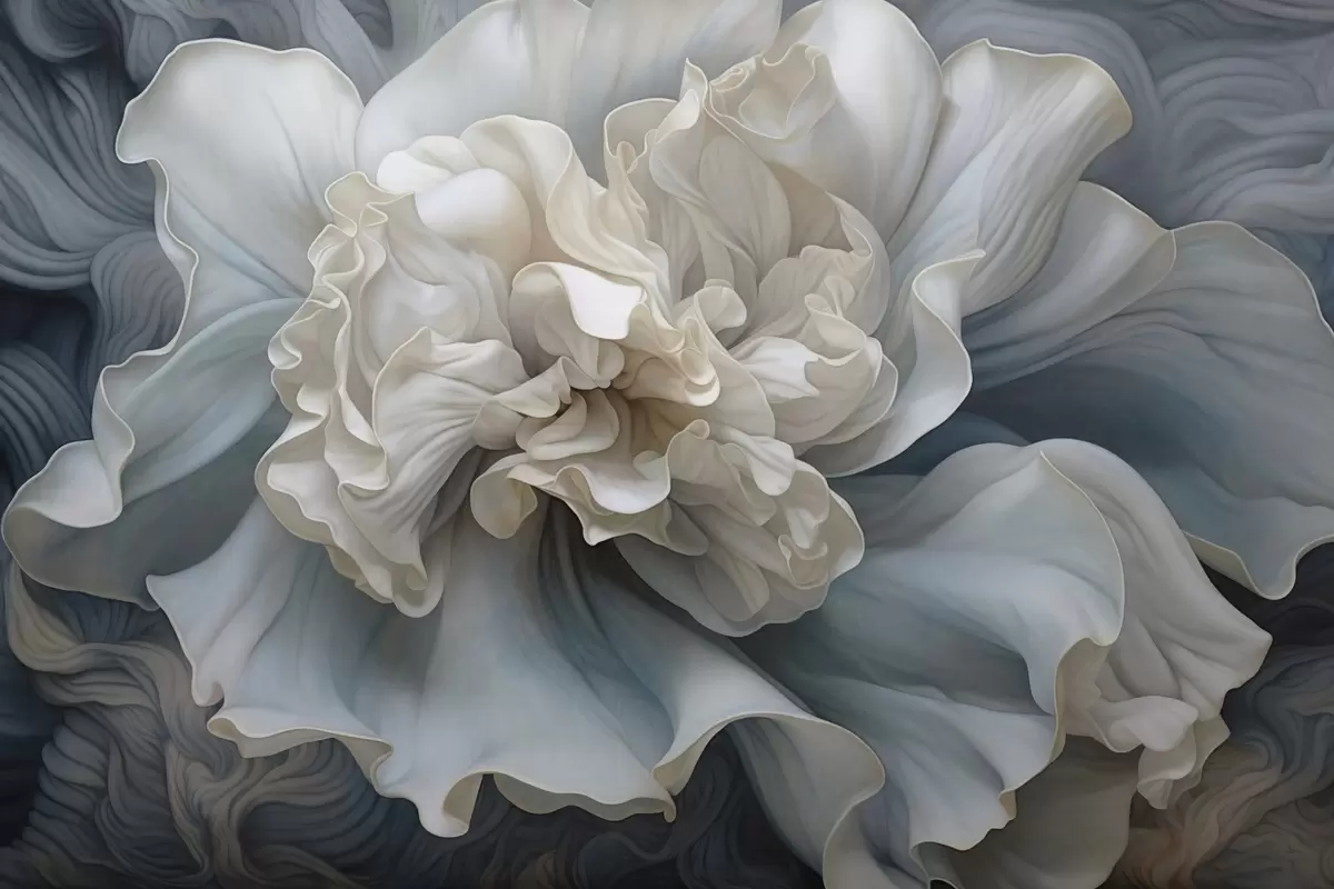 Fototapety Abstraktní velký dekorativní květ s mnoha okvětními lístky, jemný a delikátní, s modrými a šedými odstíny v pozadí Č. w09055