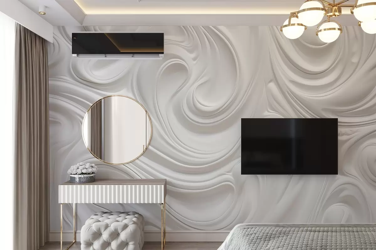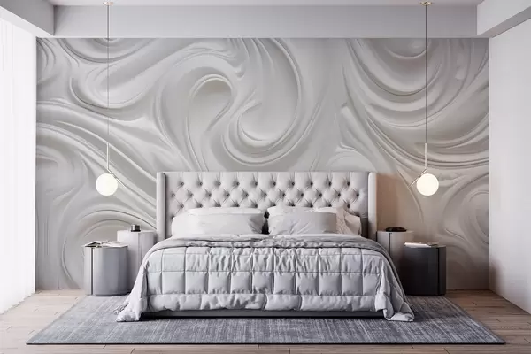 Fototapety Bílé abstraktní moderní umění s tekutými víry a vlnami, hladká textura, elegantní design, minimalistická estetika Č. w09059