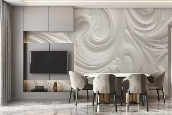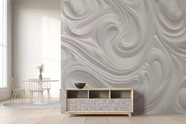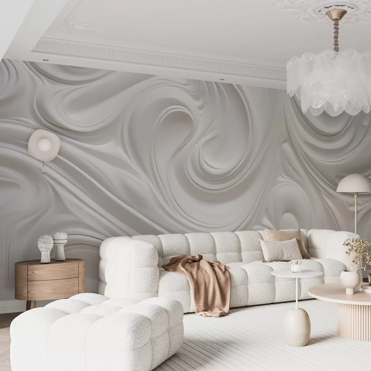 Fototapety Bílé abstraktní moderní umění s tekutými víry a vlnami, hladká textura, elegantní design, minimalistická estetika Č. w09059