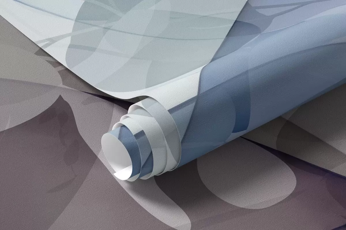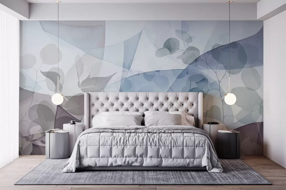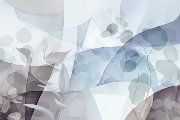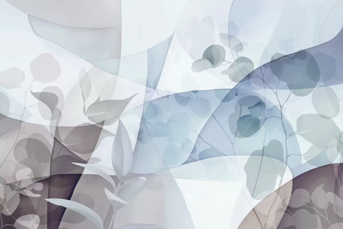 Fototapety Abstraktní botanická ilustrace s eukalyptovými listy a geometrickými tvary v jemných tlumených barvách modré, hnědé a bílé Č. w09061