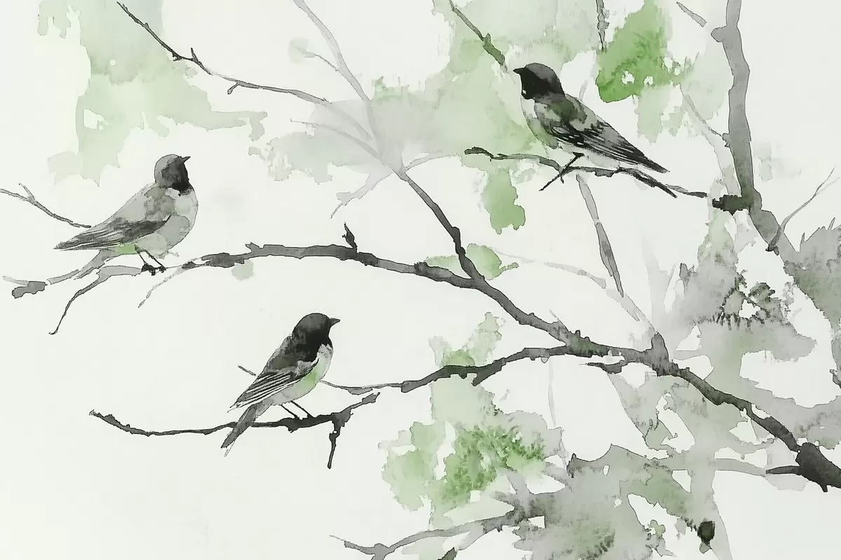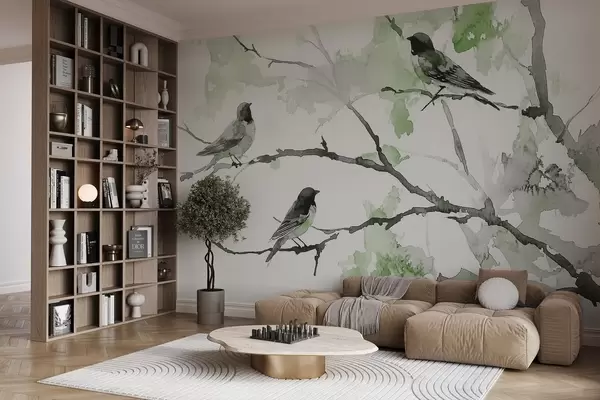 Fototapety Ptáci na větvích stromů ve stylu akvarelu Č. w09064v3