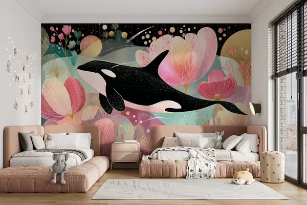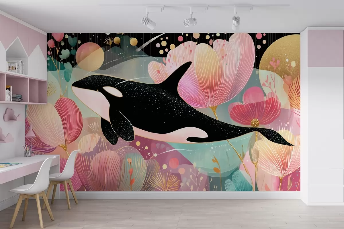 Fototapety Plavající černá kosatka na pozadí růžových květů Č. w09074