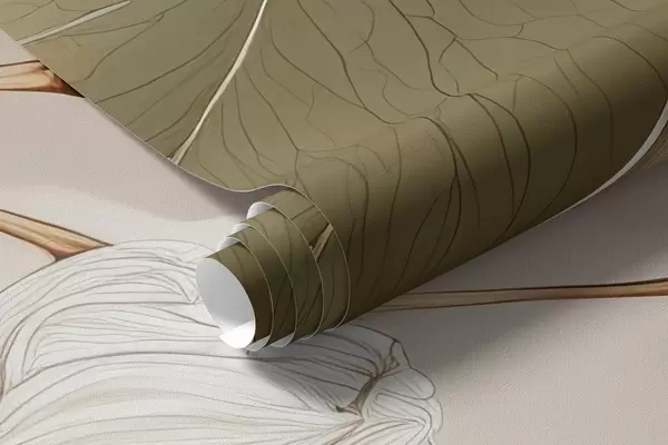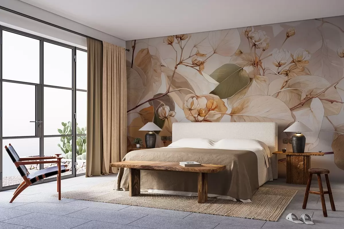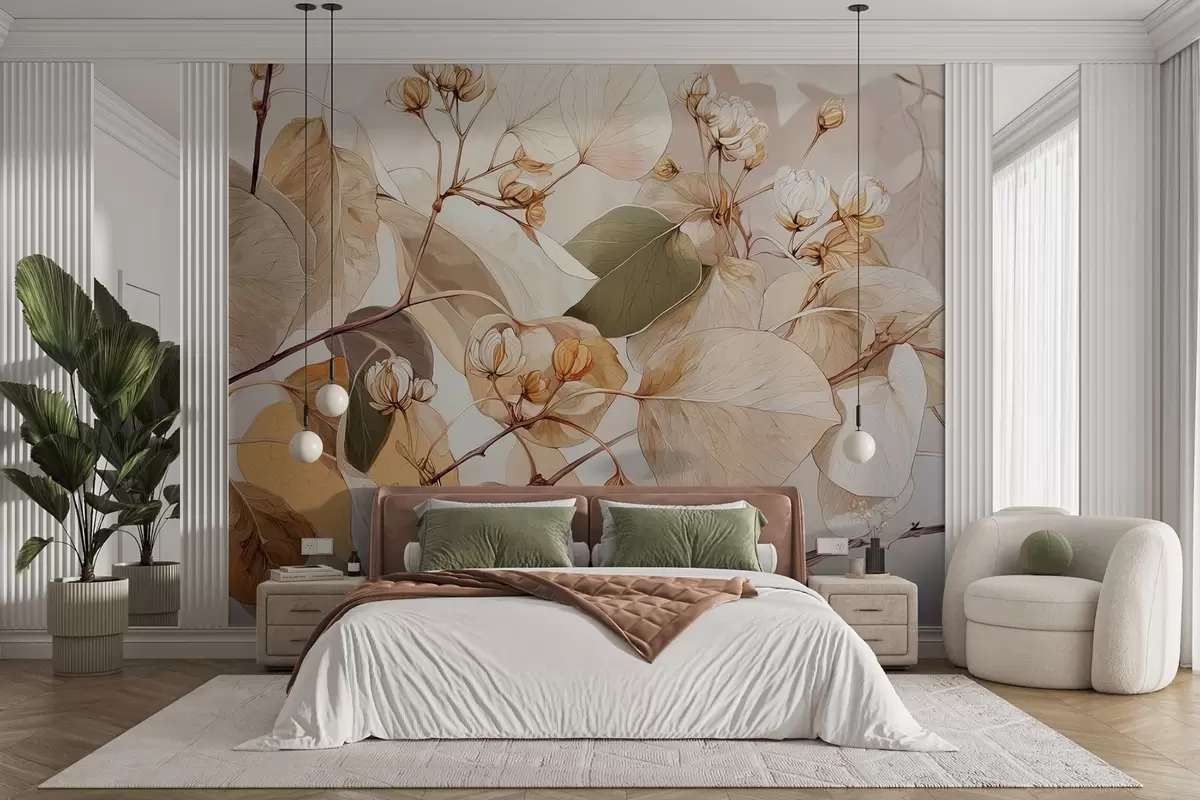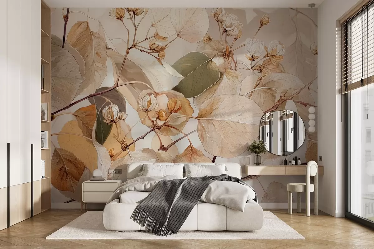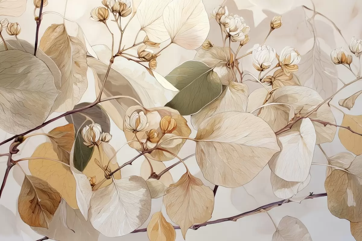 Fototapety Větve osikových listů a květů ve stylu olejomalby v béžových tónech Č. w09082