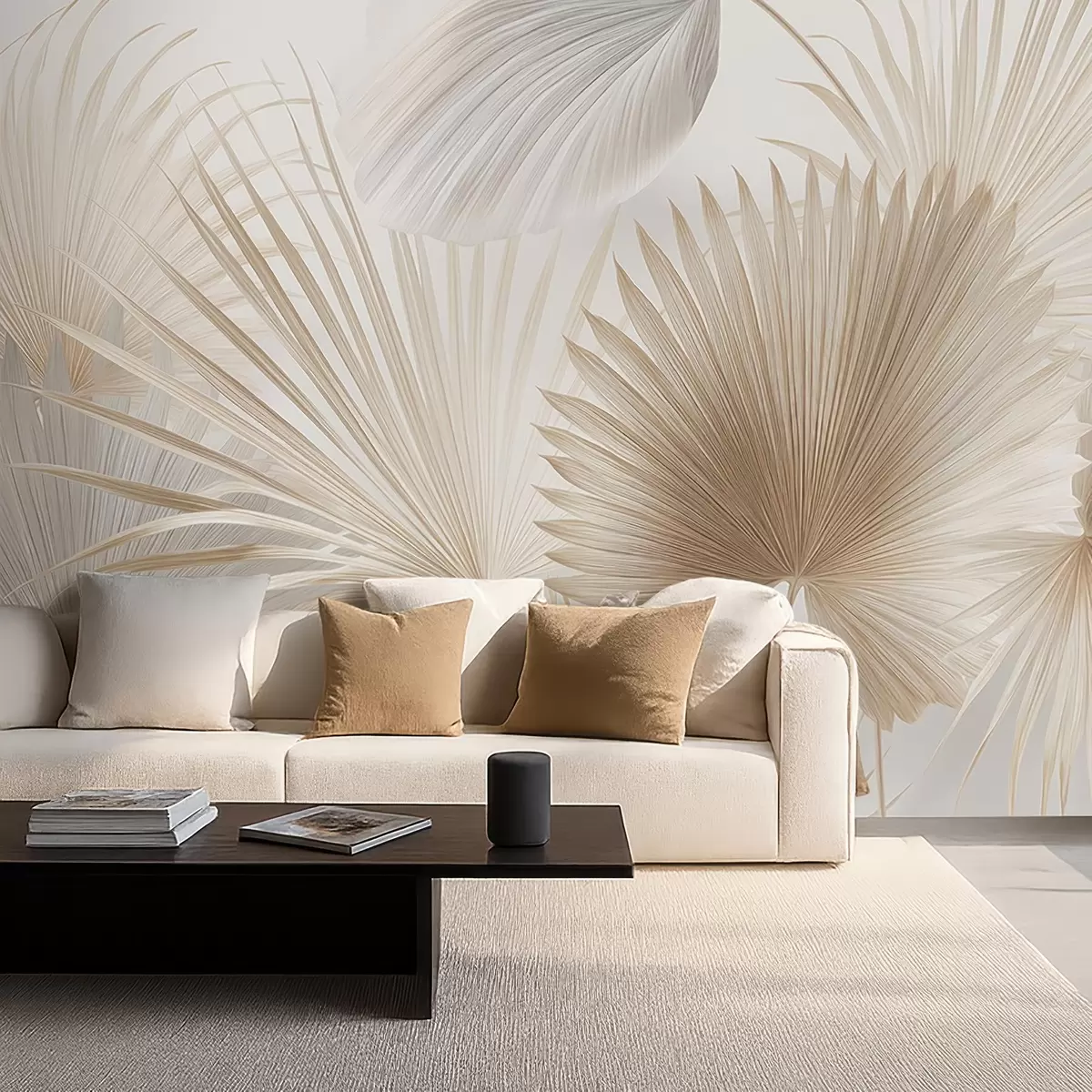 Fototapety Měkké vějíře z tropických listů ve světle béžových a namodralých tónech Č. w09084