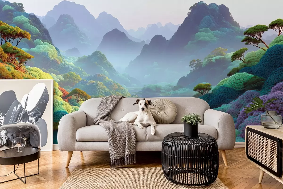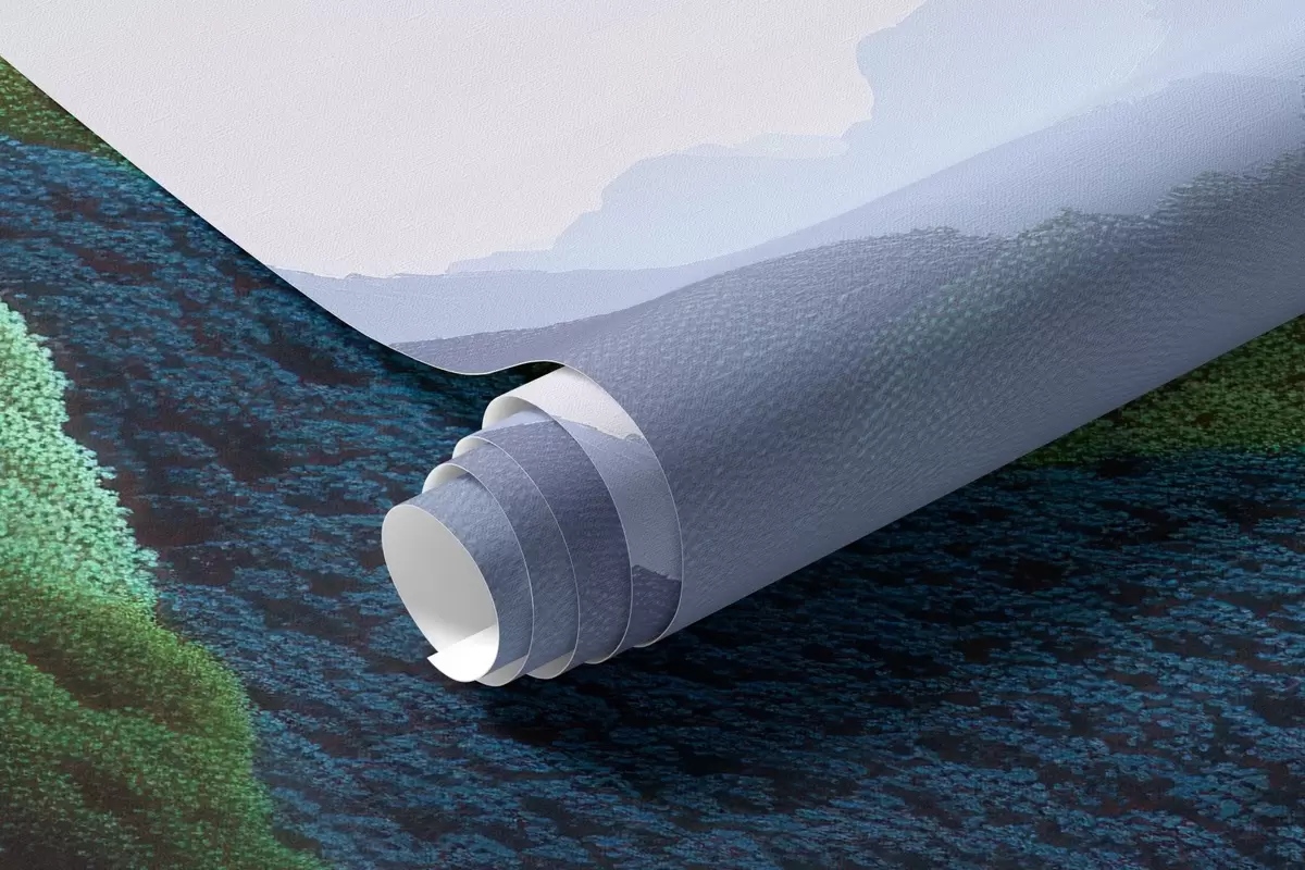 Fototapety Horská krajina s řekou v modrých tónech se stromy a keři Č. w09088
