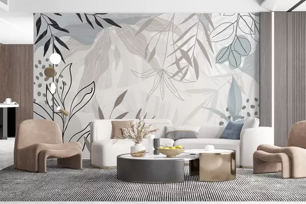 Fototapety Abstraktní květinový moderní design s pastelově béžovými, šedými, modrými a černými listy, jemnými čarami a měkkým pozadím Č. w09105