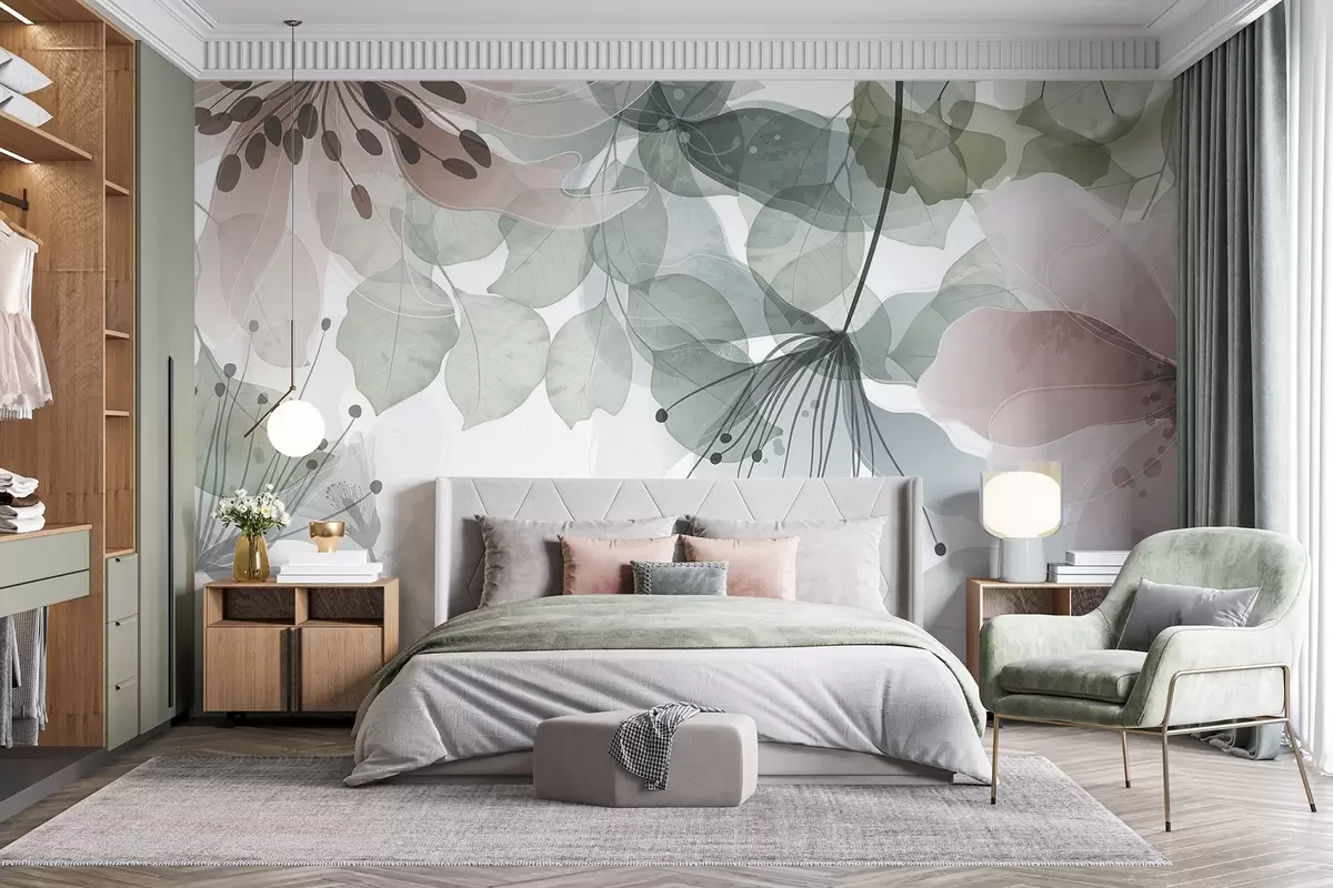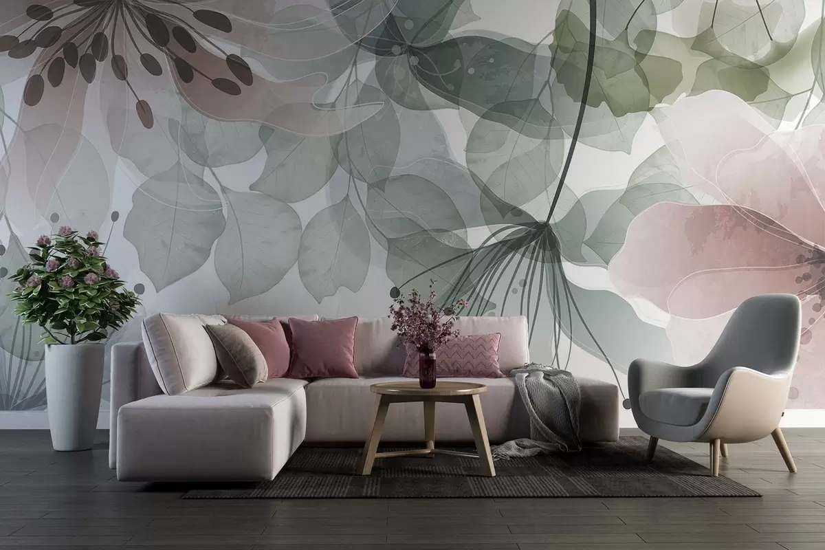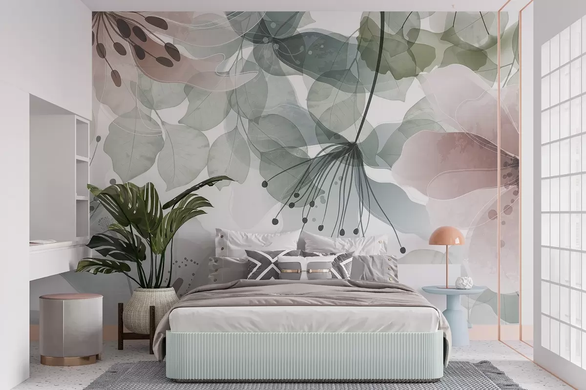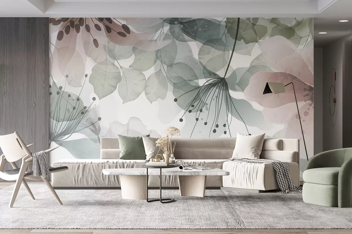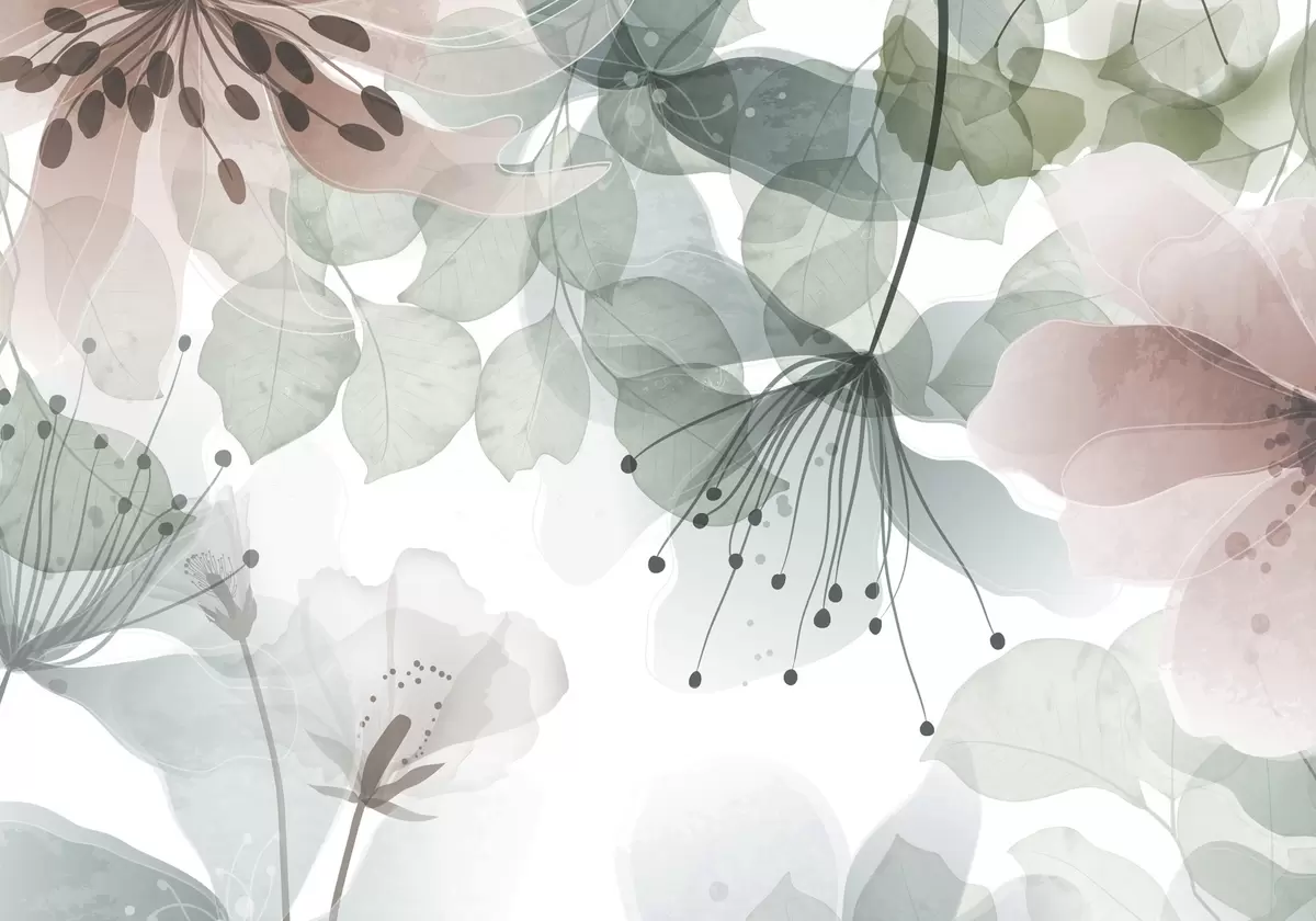 Fototapety Květy a listy v pastelových barvách, průsvitné okvětní lístky a listy, jemný akvarelový efekt, jemné linie, bílé pozadí Č. w09107