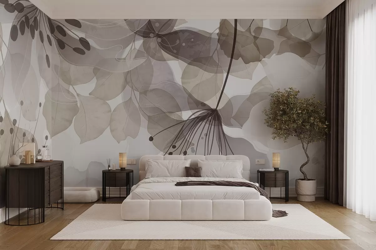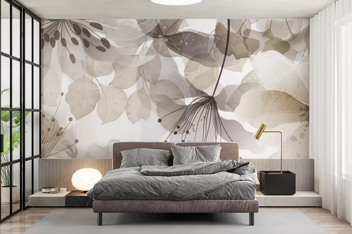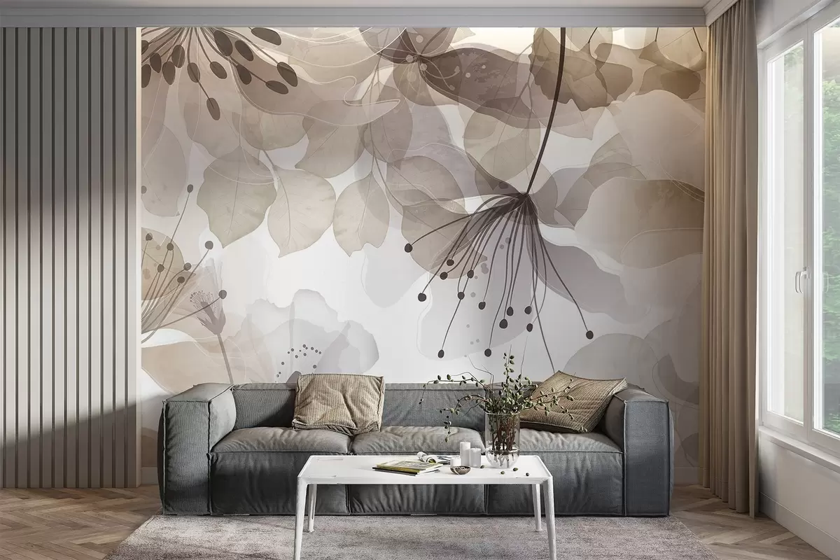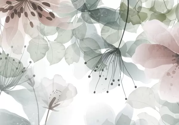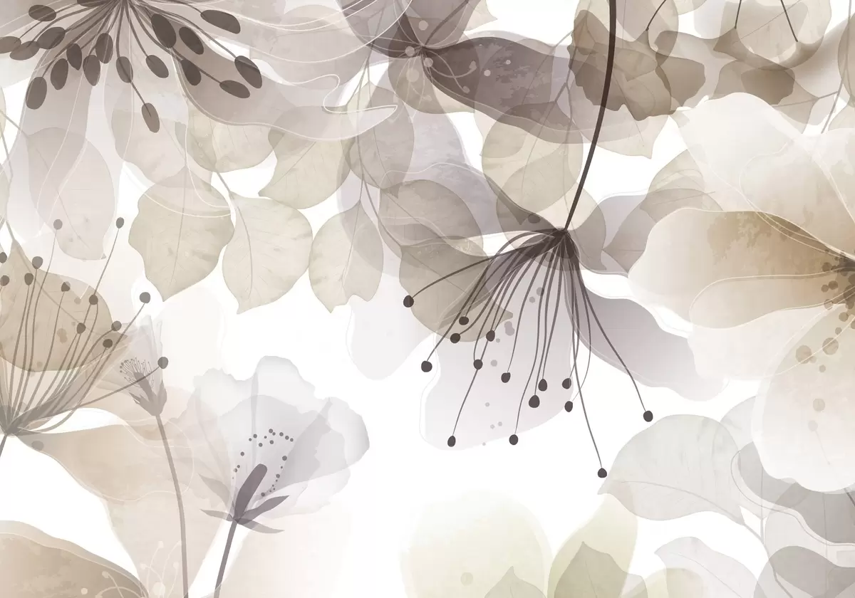 Fototapety Květy a listy v béžových barvách, průsvitné okvětní lístky a listy, jemný akvarelový efekt, jemné linie, bílé pozadí Č. w09107v1