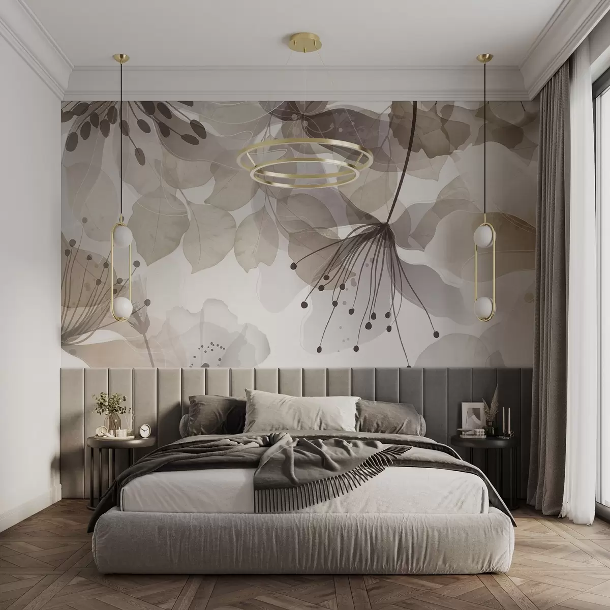 Fototapety Květy a listy v béžových barvách, průsvitné okvětní lístky a listy, jemný akvarelový efekt, jemné linie, bílé pozadí Č. w09107v1