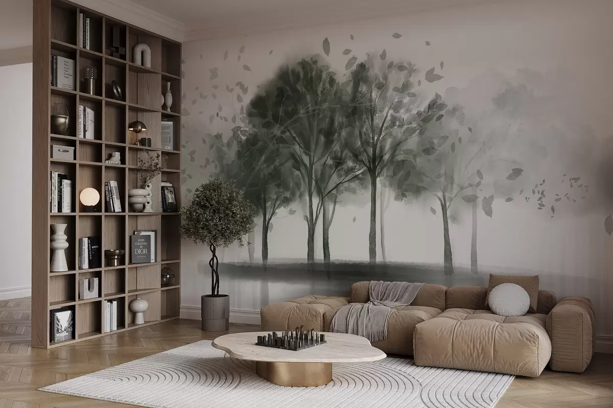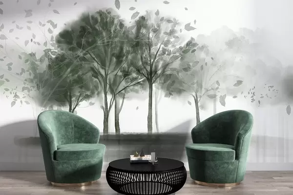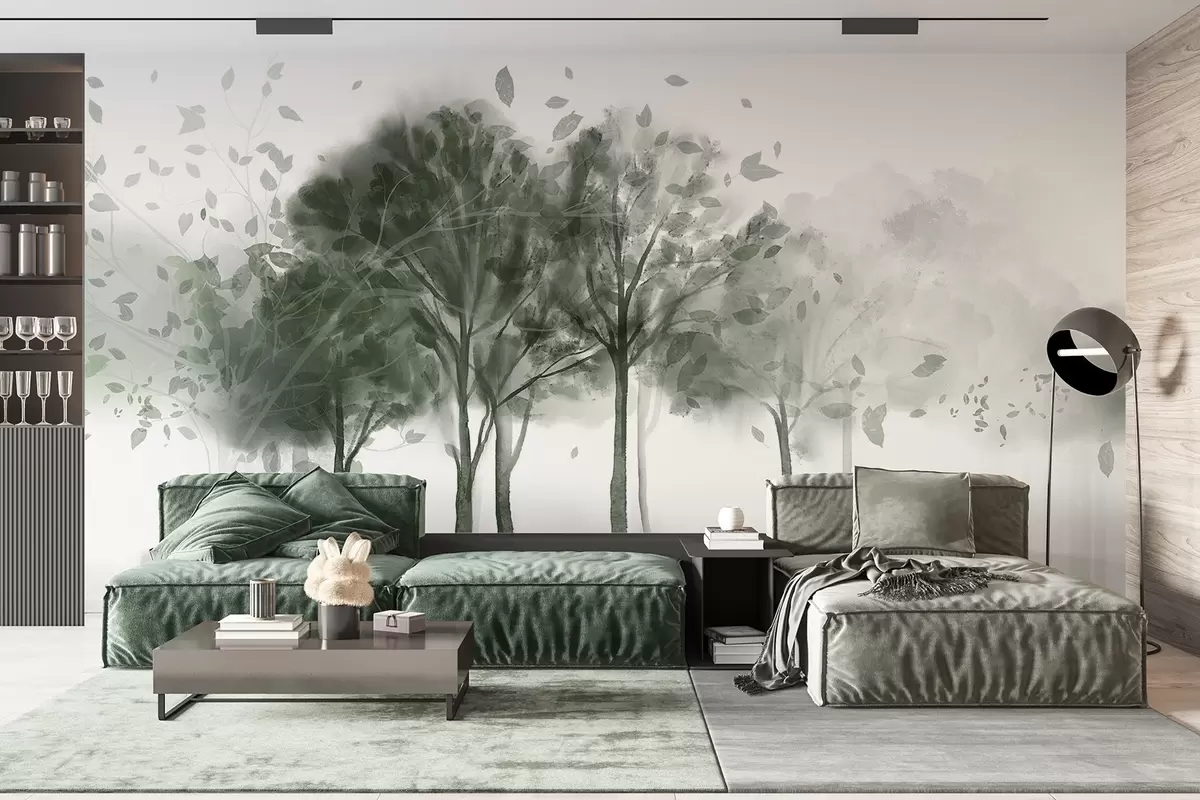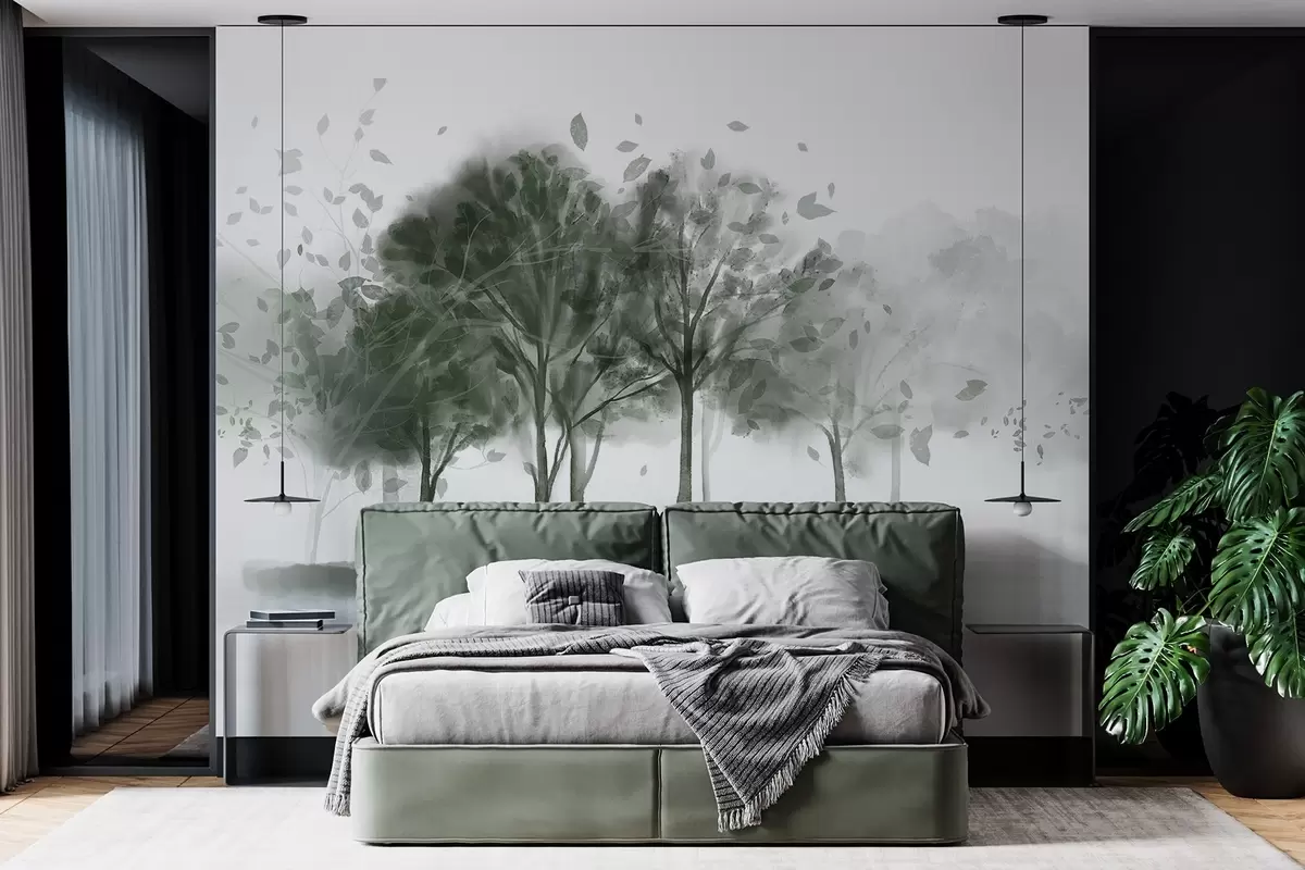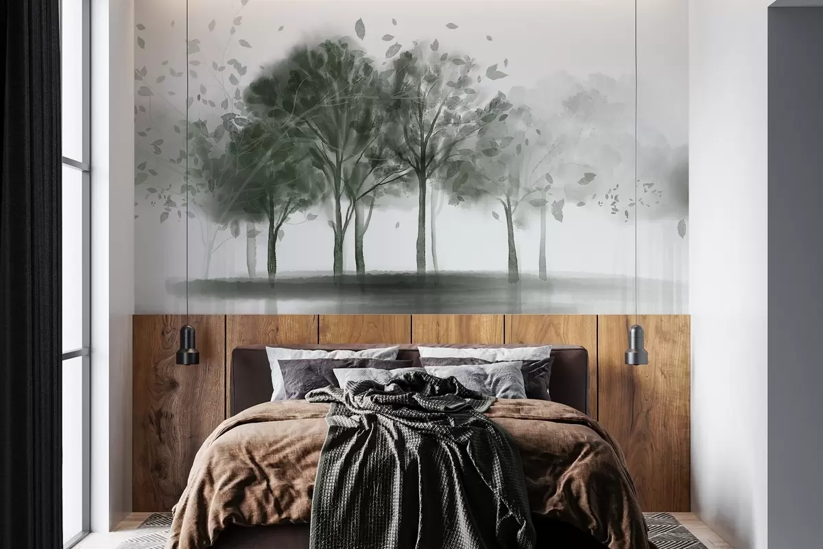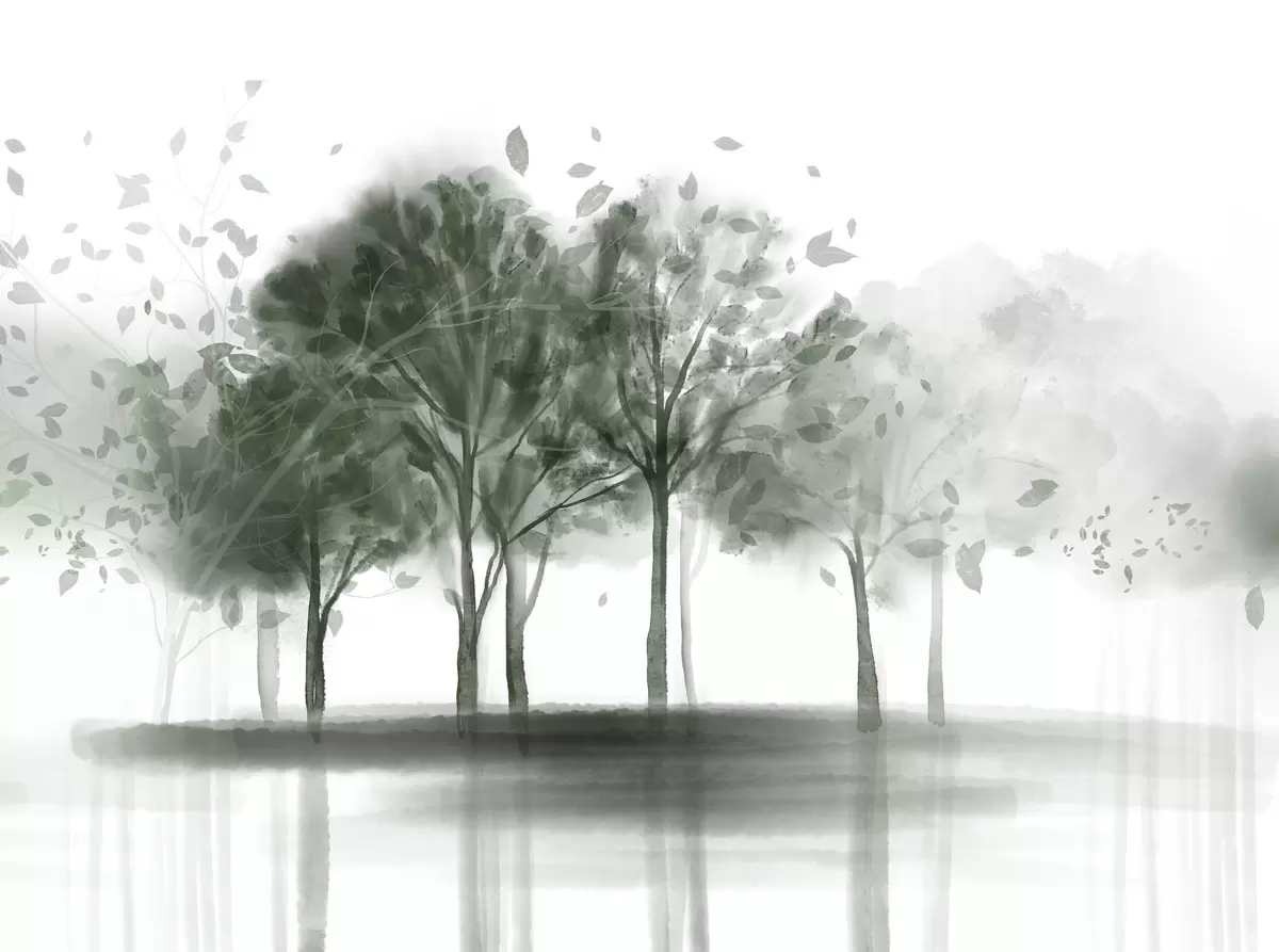 Fototapety Abstraktní krajina se stromy se zelenými listy odrážejícími se ve vodě, akvarel ve stylu textury Č. w09109