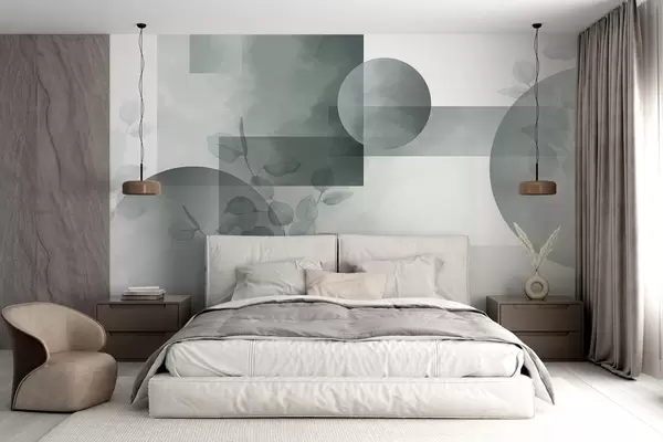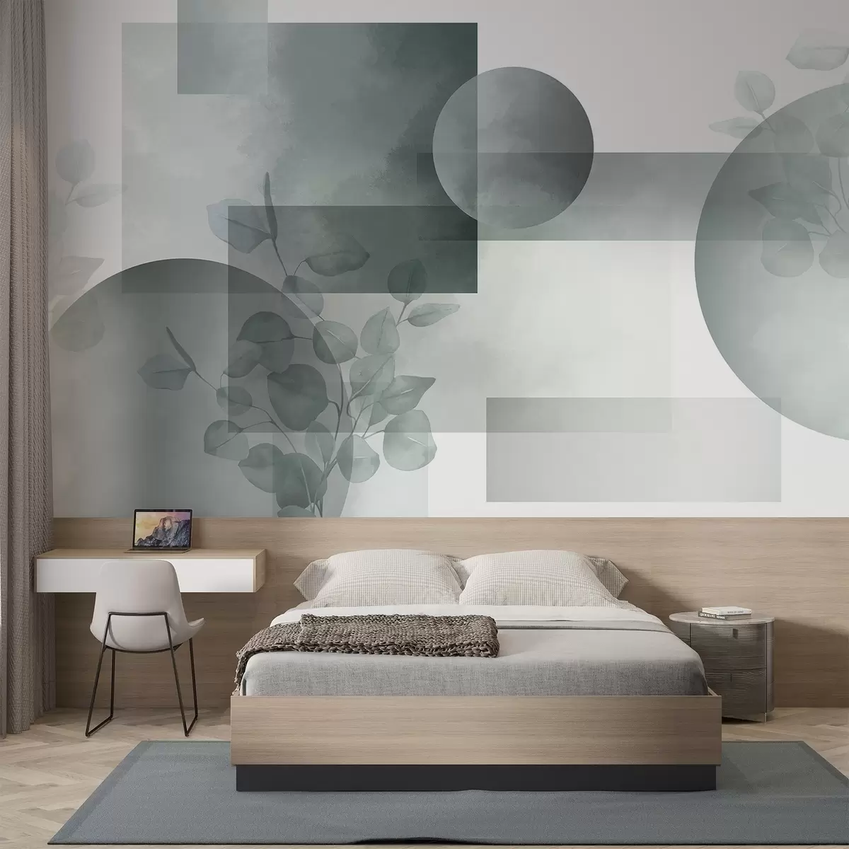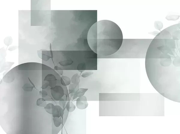 Fototapety Abstraktní moderní minimalistický geometrický design s kruhy a obdélníky, eukalyptové listy, akvarelový efekt Č. w09110