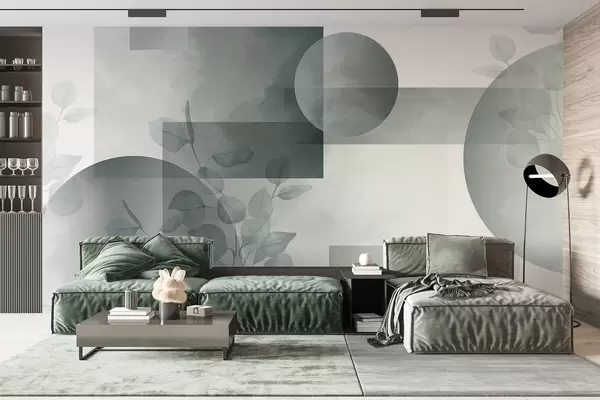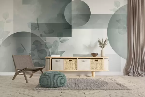 Fototapety Abstraktní moderní minimalistický geometrický design s kruhy a obdélníky, eukalyptové listy, akvarelový efekt Č. w09110