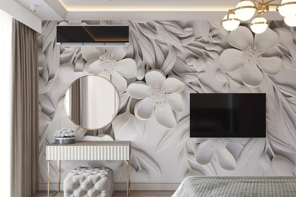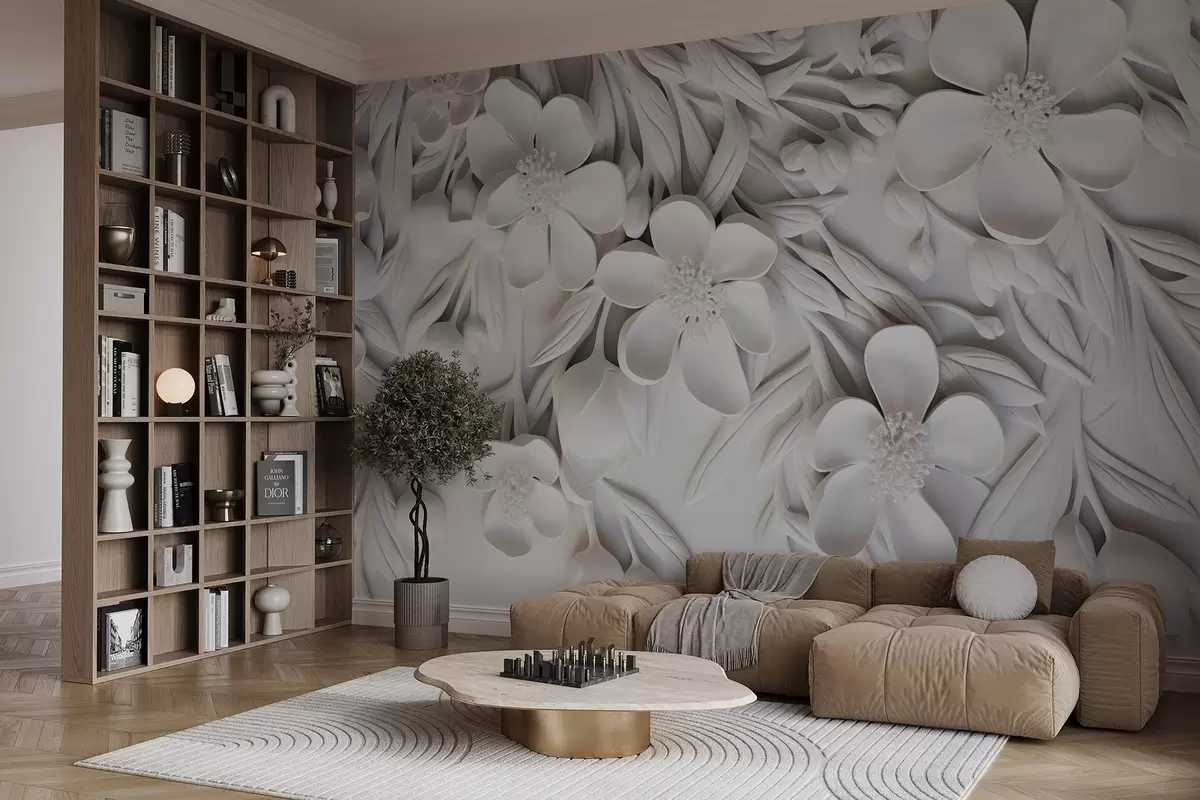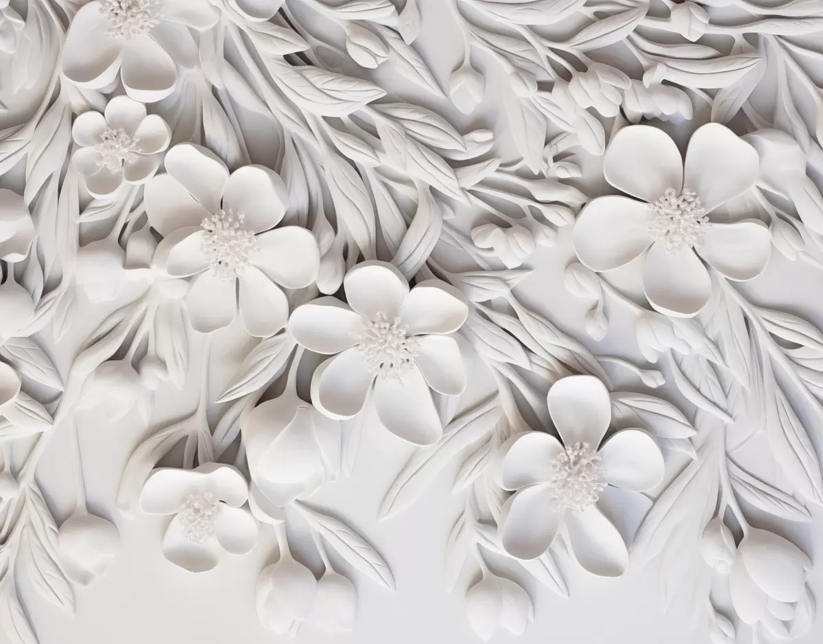 Fototapety Bílé květy a listy na bílém pozadí, květinový elegantní, dekorativní design, složité detaily Č. w09113