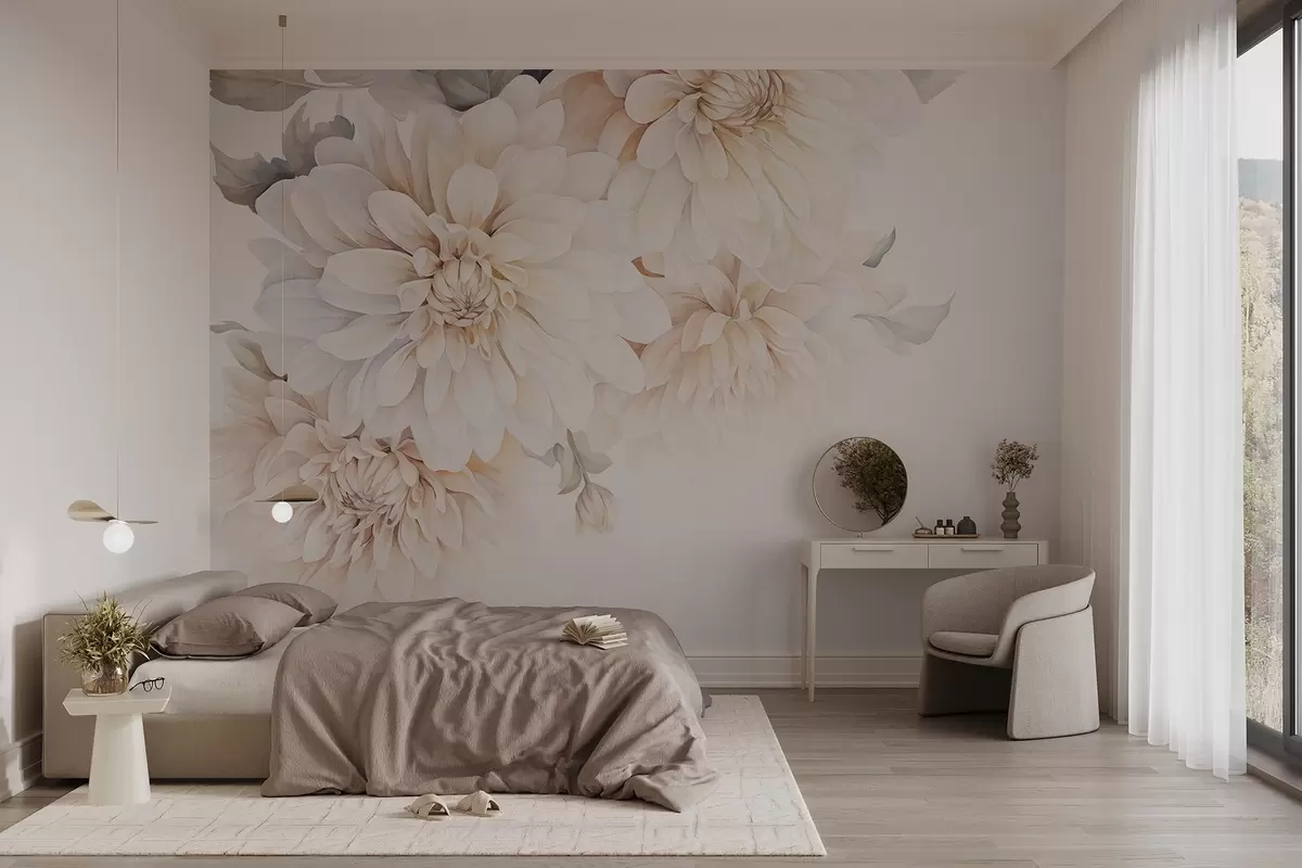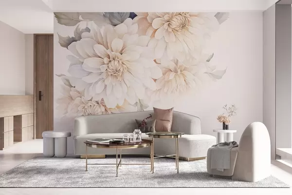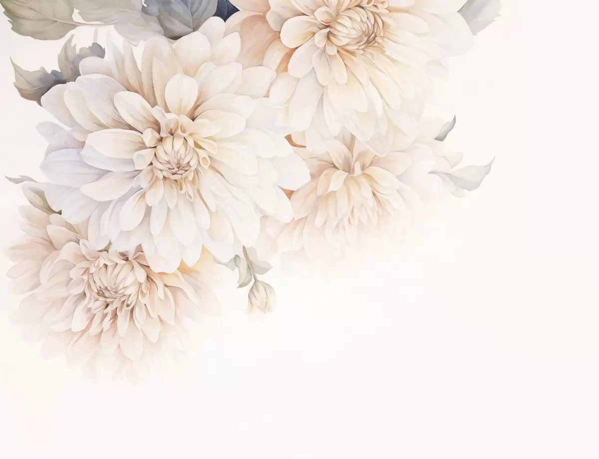 Fototapety Pastelové jiřiny s jemnými, delikátními broskvovými a bílými světlými okvětními lístky v akvarelovém stylu, měkké pozadí Č. w09115