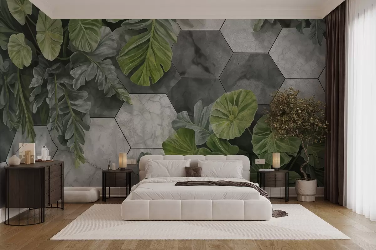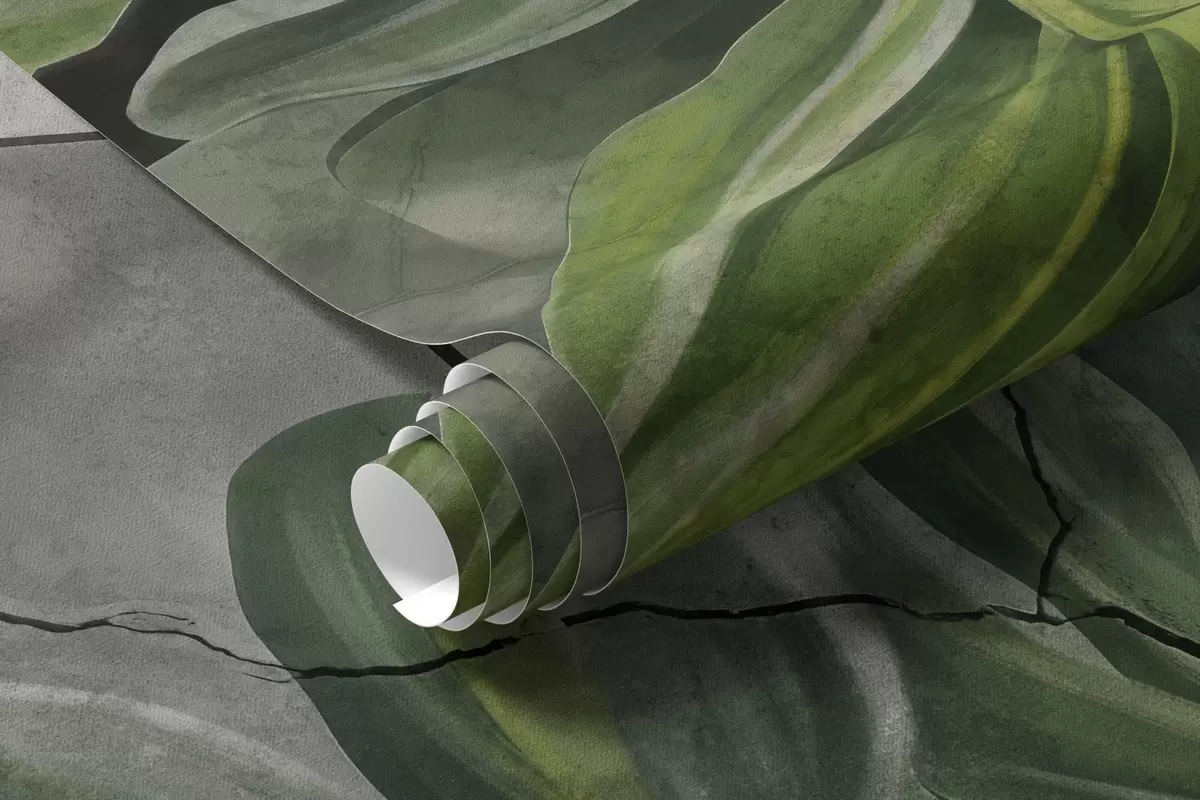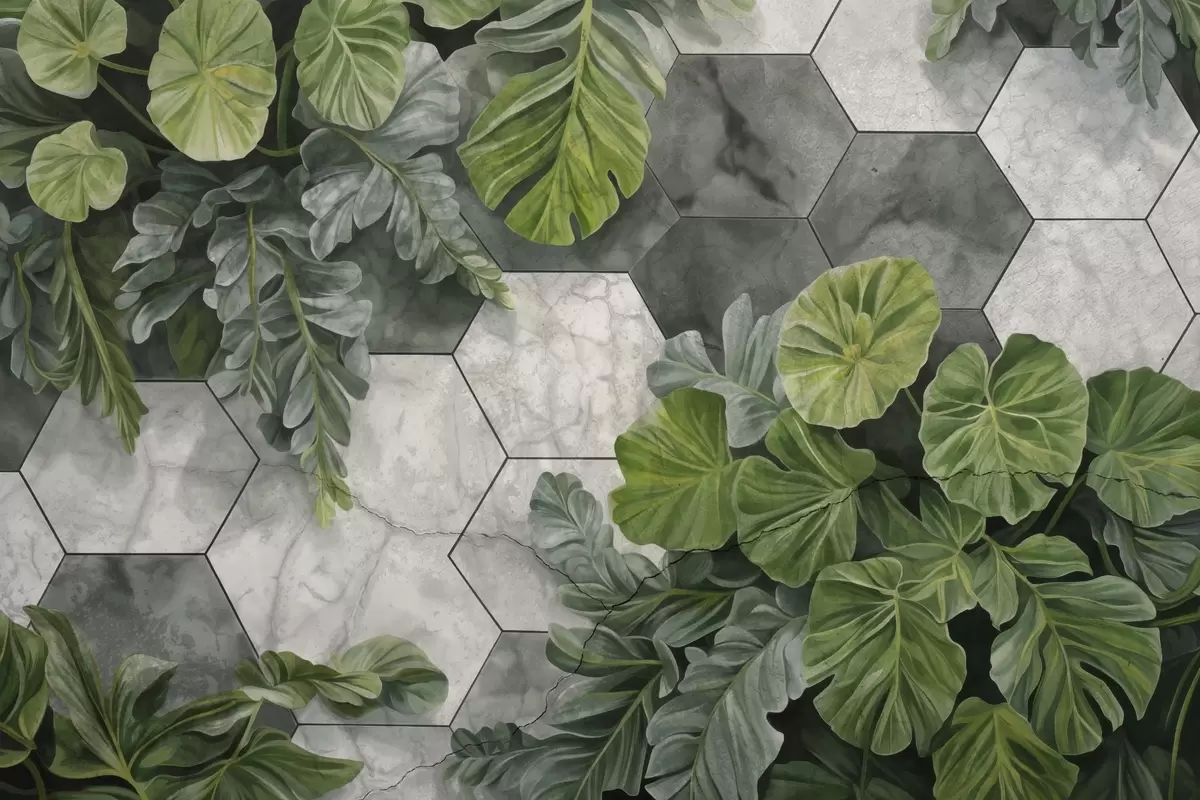Fototapety Zelené tropické listy a rostliny na pozadí šedých a bílých dlaždic s texturou, svěží zeleň moderní design Č. w09117