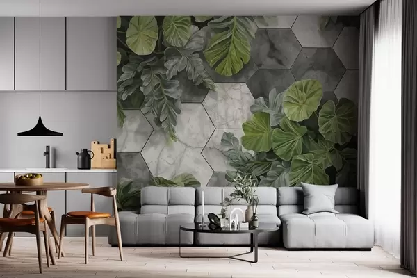 Fototapety Zelené tropické listy a rostliny na pozadí šedých a bílých dlaždic s texturou, svěží zeleň moderní design Č. w09117