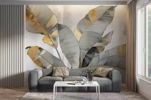 Fototapet Banánové tropické listy s texturou v šedých a žlutých tónech, moderní styl, neutrální pozadí, dekorativní malba w09118