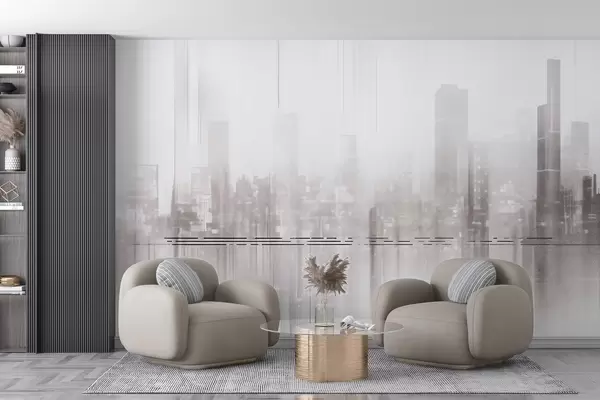 Fototapety Abstraktní texturovaná městská krajina s vysokými budovami a pásy v odstínech šedé a bílé barvy, které vytvářejí mlhavý efekt Č. w09119