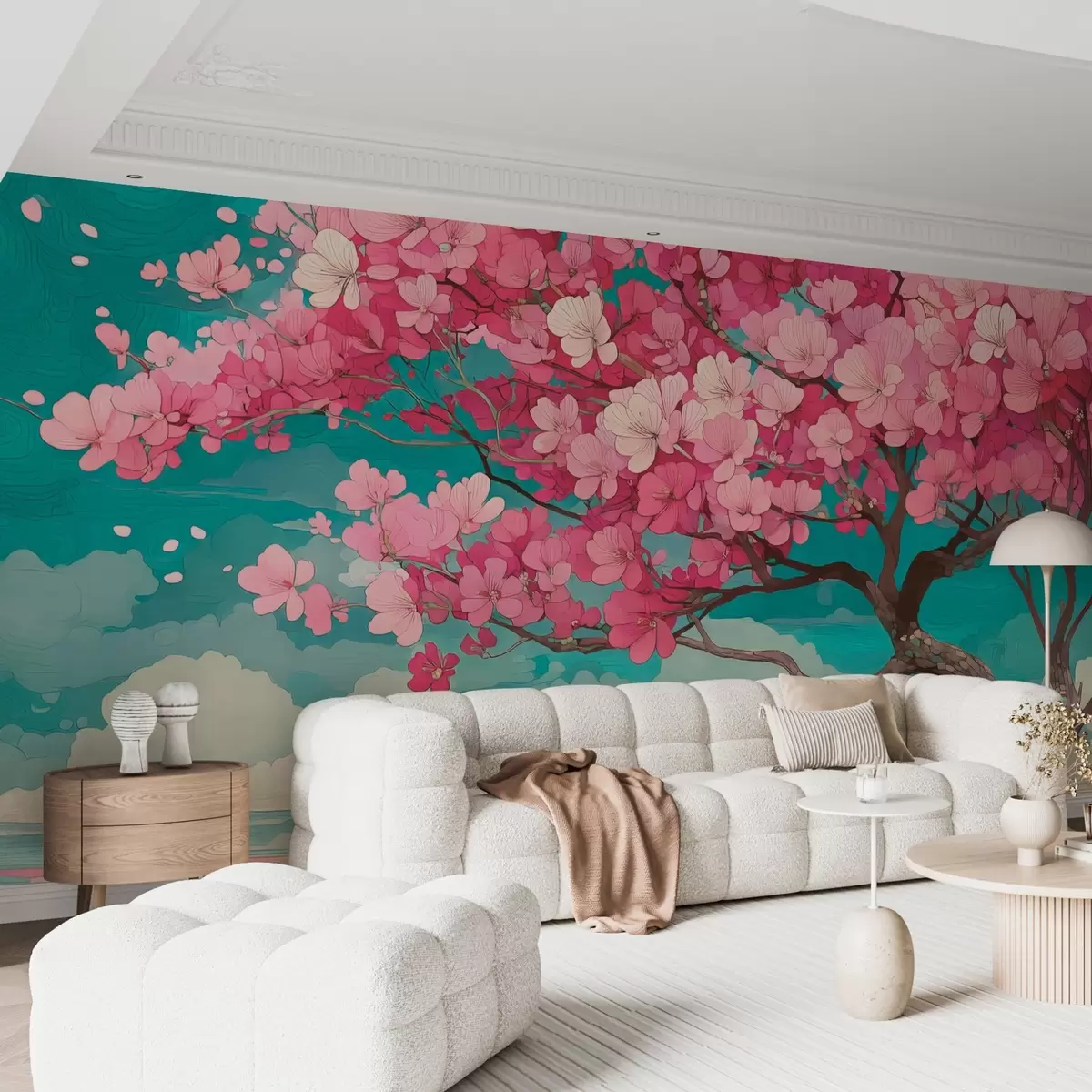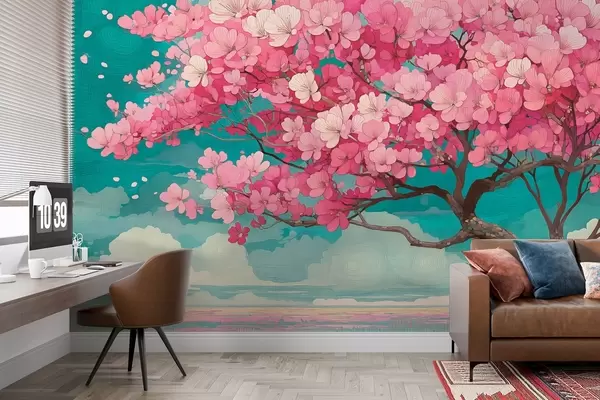 Fototapety Růžový třešňový strom s padajícími okvětními lístky a modrou oblohou v romantickém stylu Č. w09120