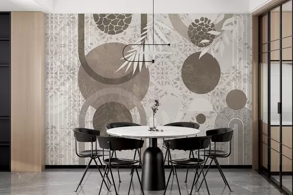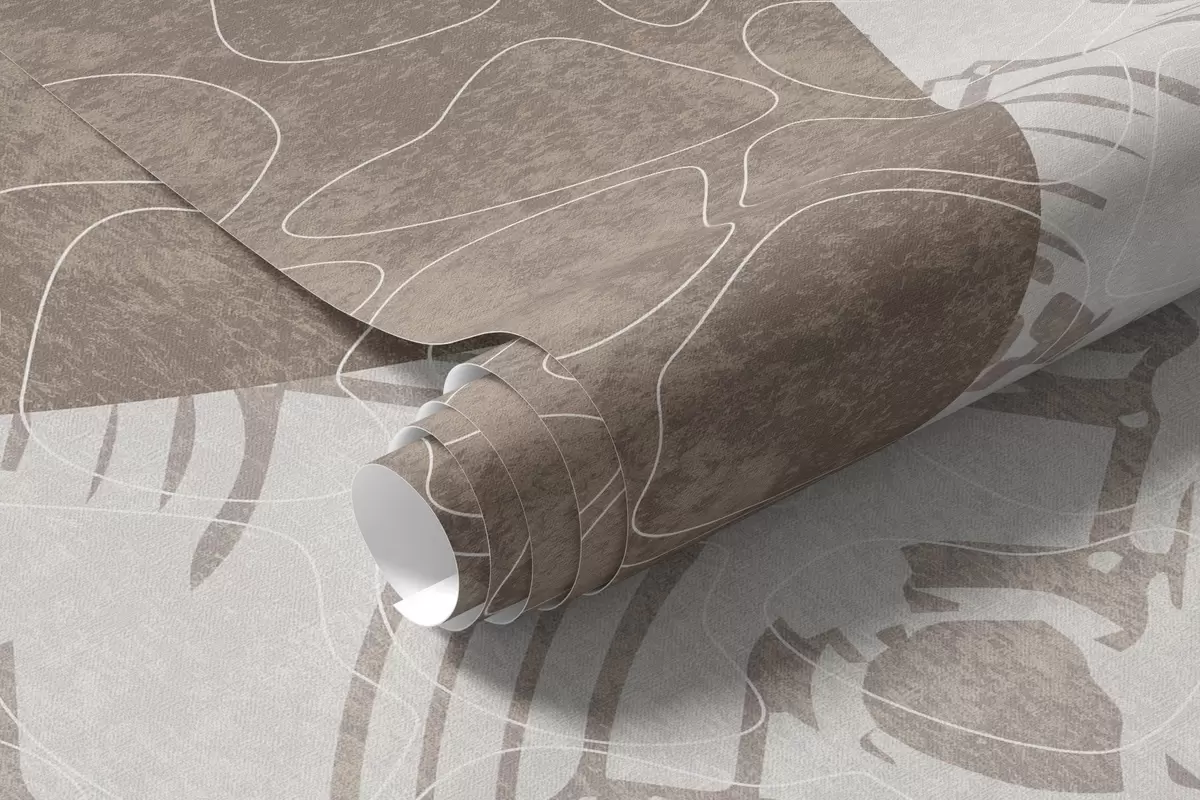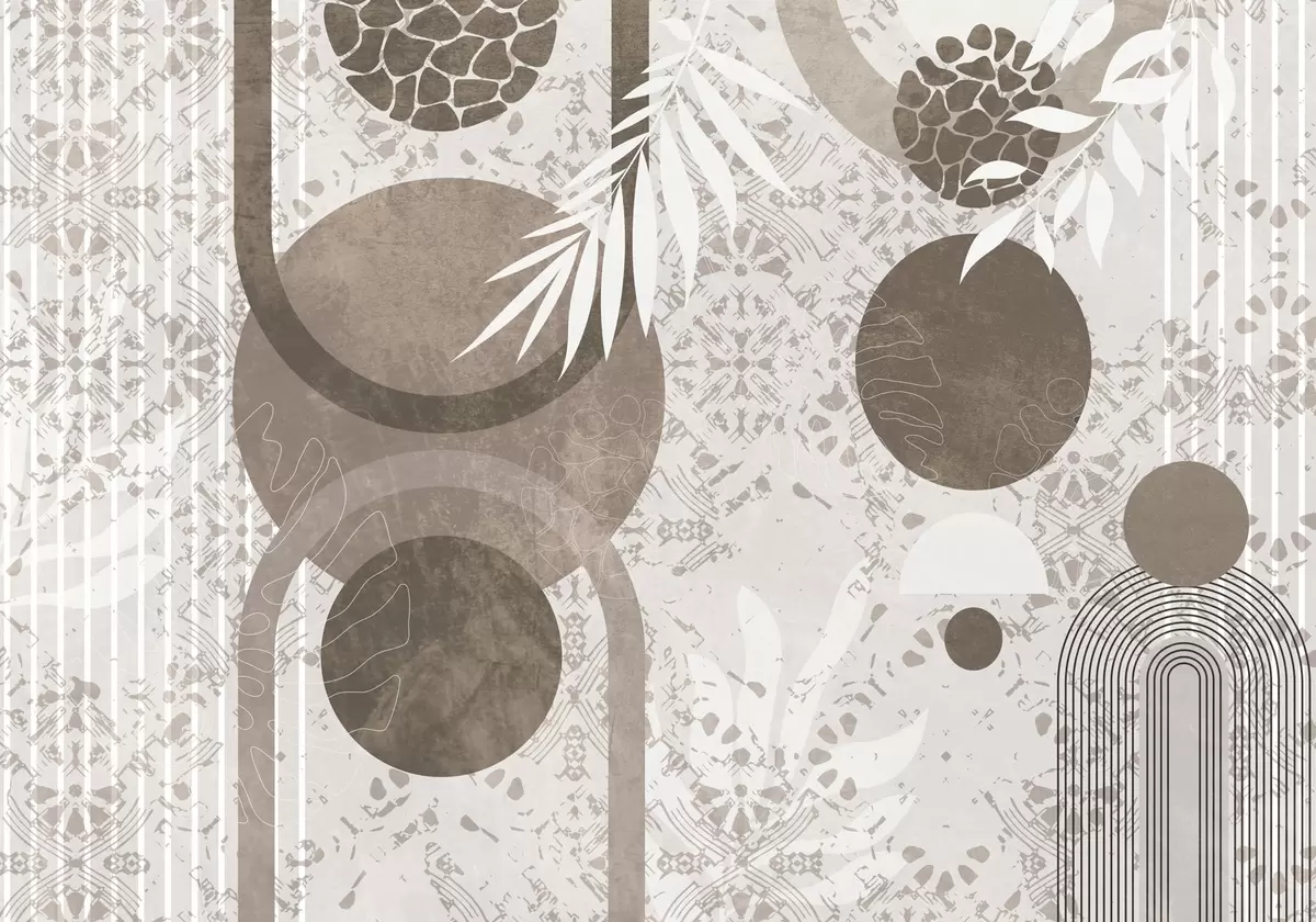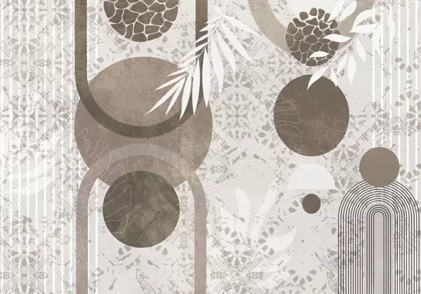 Fototapety Abstraktní texturální geometrické tvary v hnědé a bílé barvě, kruhy, oblouky a botanické prvky, moderní a minimalistický design Č. w09130