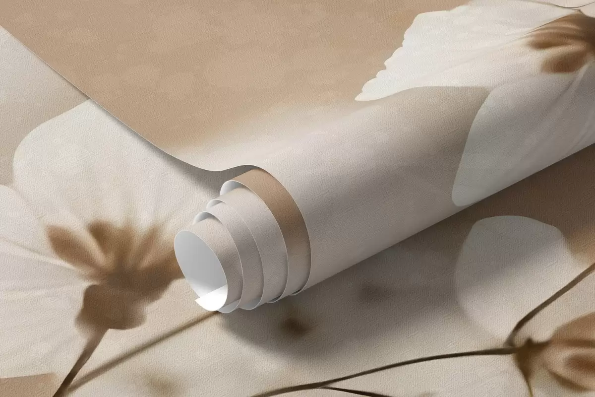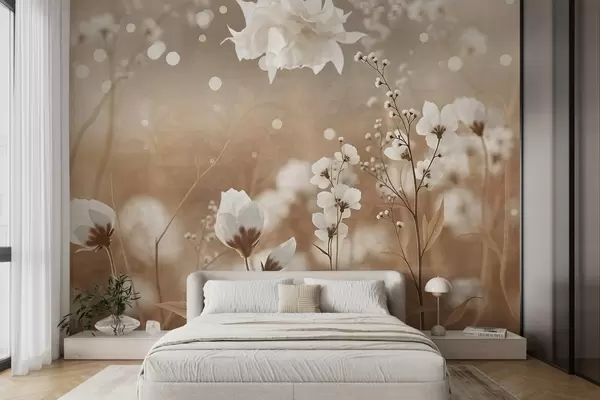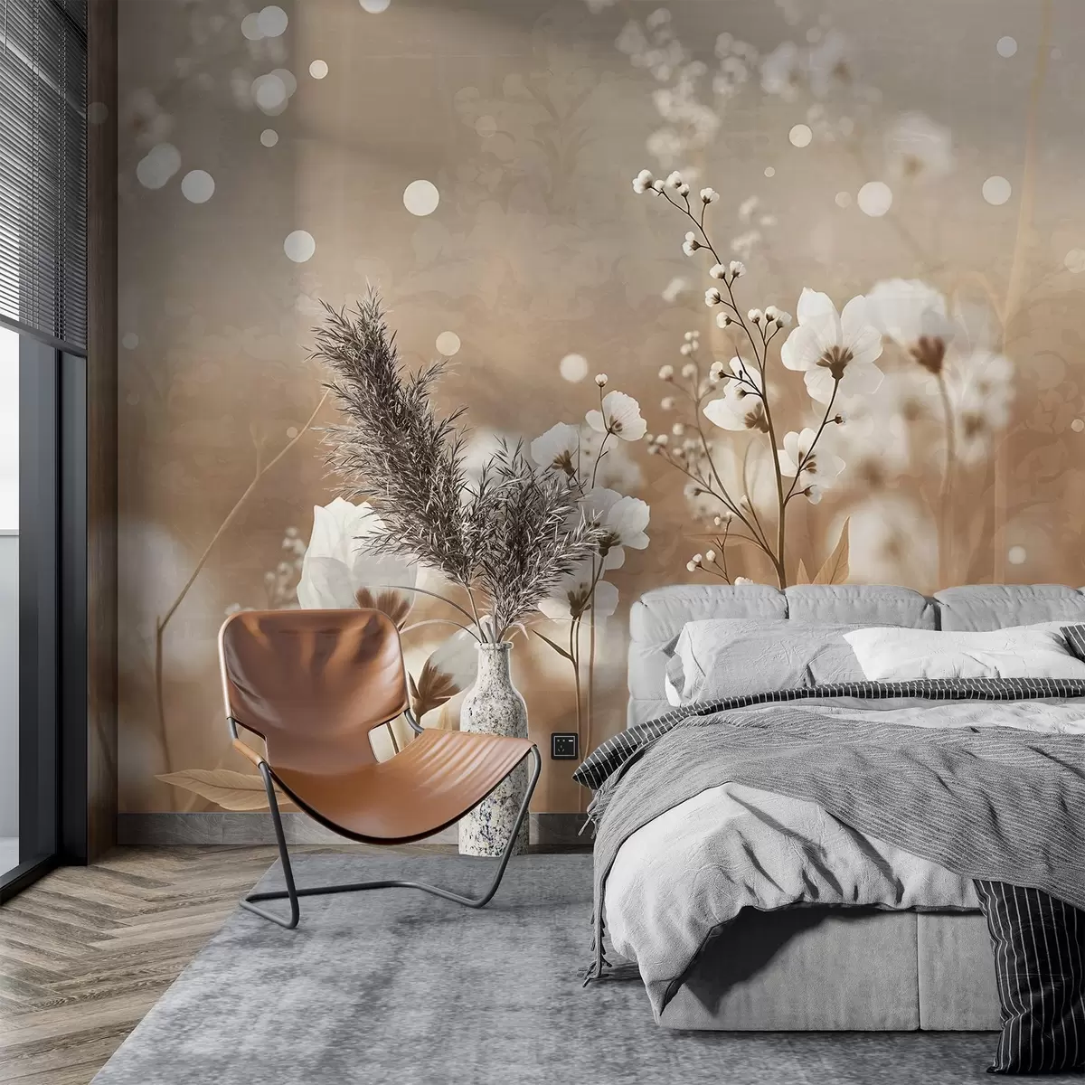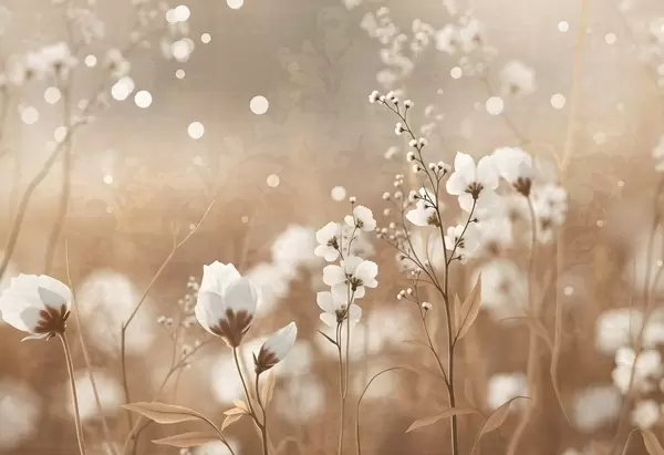 Fototapety Bílé květy s hnědými stonky a listy v poli, bokeh efekt, teplá paleta barev, elegantní umělecké dílo inspirované přírodou Č. w09135