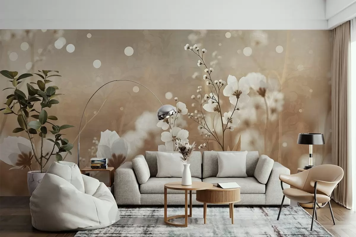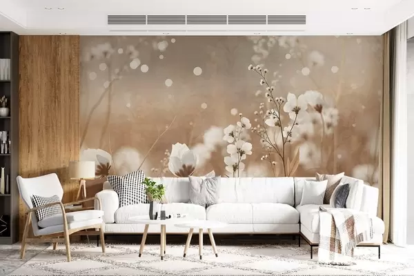 Fototapety Bílé květy s hnědými stonky a listy v poli, bokeh efekt, teplá paleta barev, elegantní umělecké dílo inspirované přírodou Č. w09135