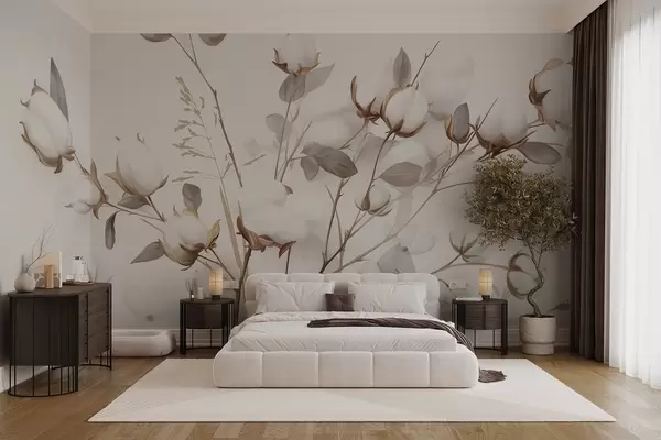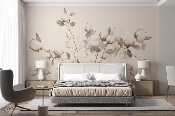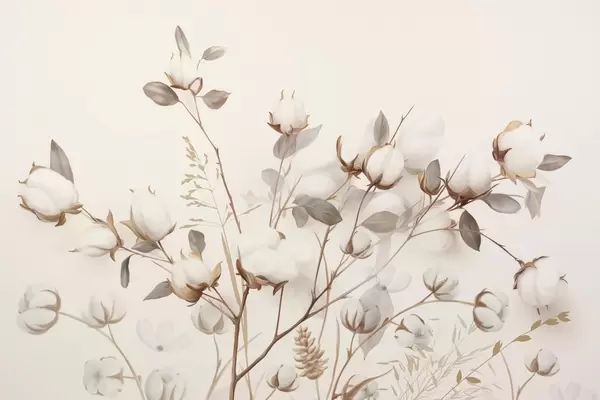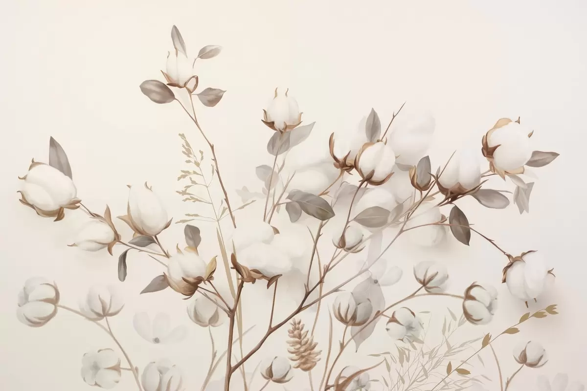 Fototapety Bavlněné květiny se stonky a listy ve světle hnědé barevné paletě, béžové pozadí, měkké a jemné, akvarelový styl Č. w09141