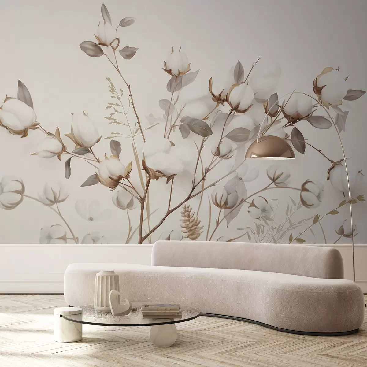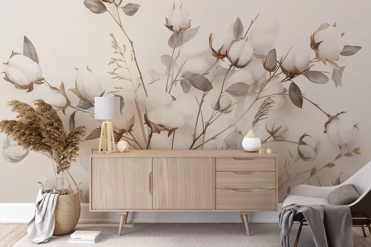 Fototapety Bavlněné květiny se stonky a listy ve světle hnědé barevné paletě, béžové pozadí, měkké a jemné, akvarelový styl Č. w09141