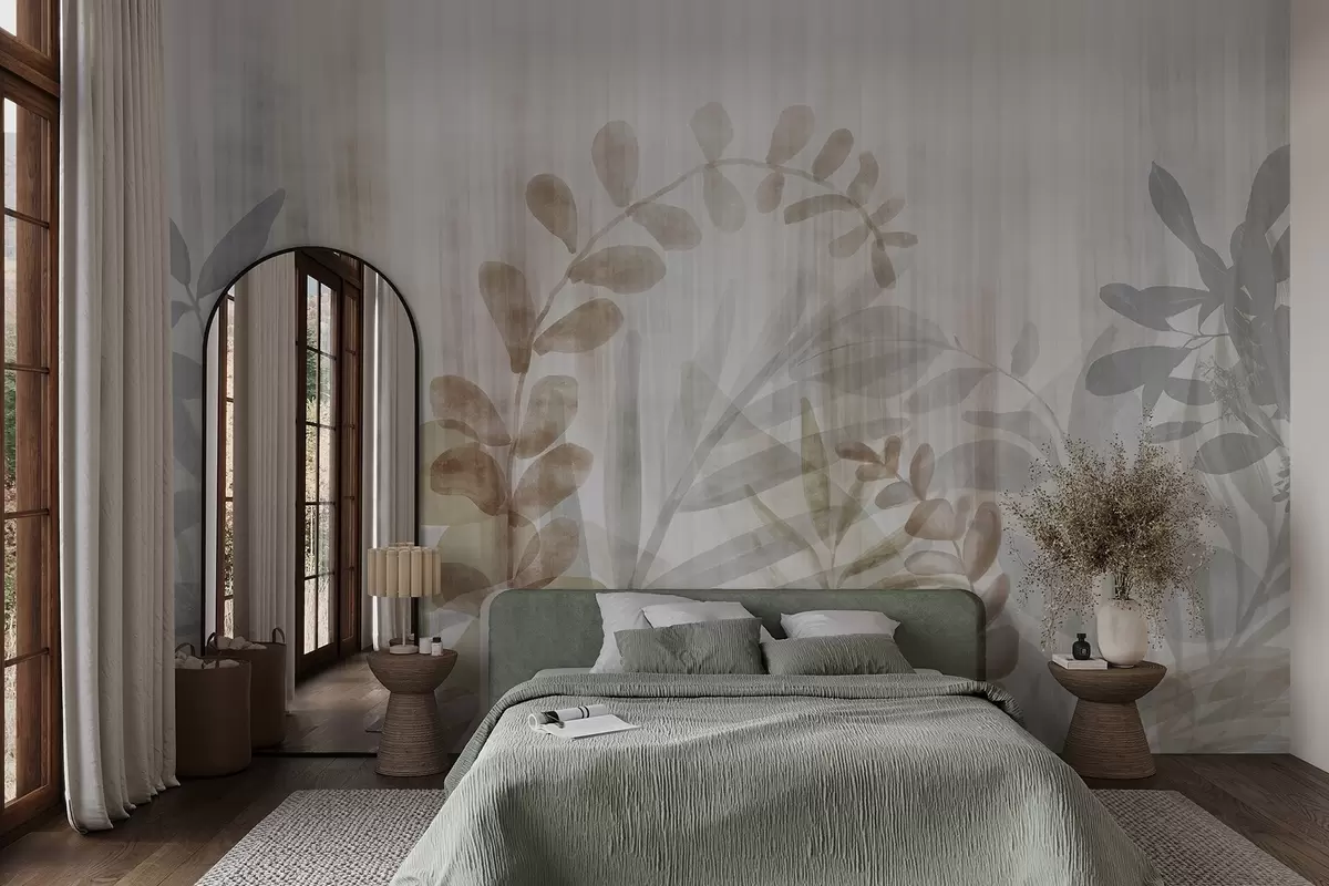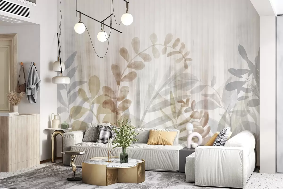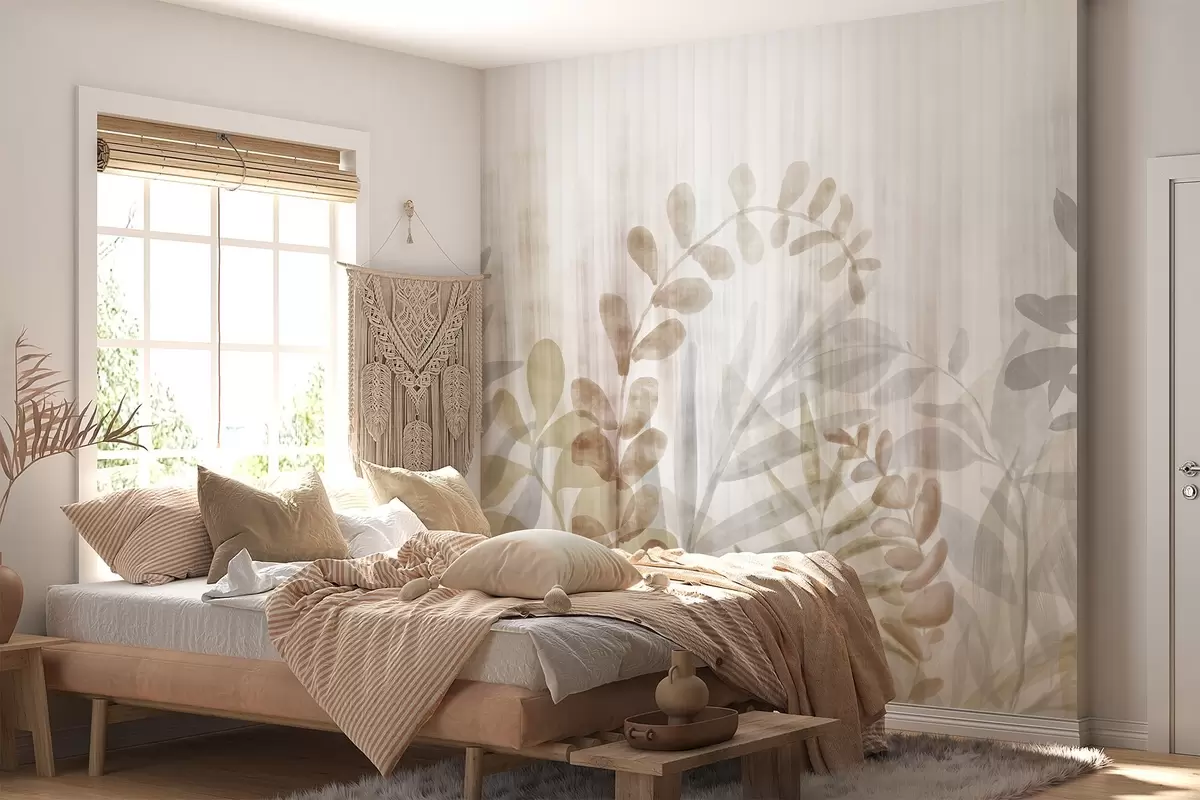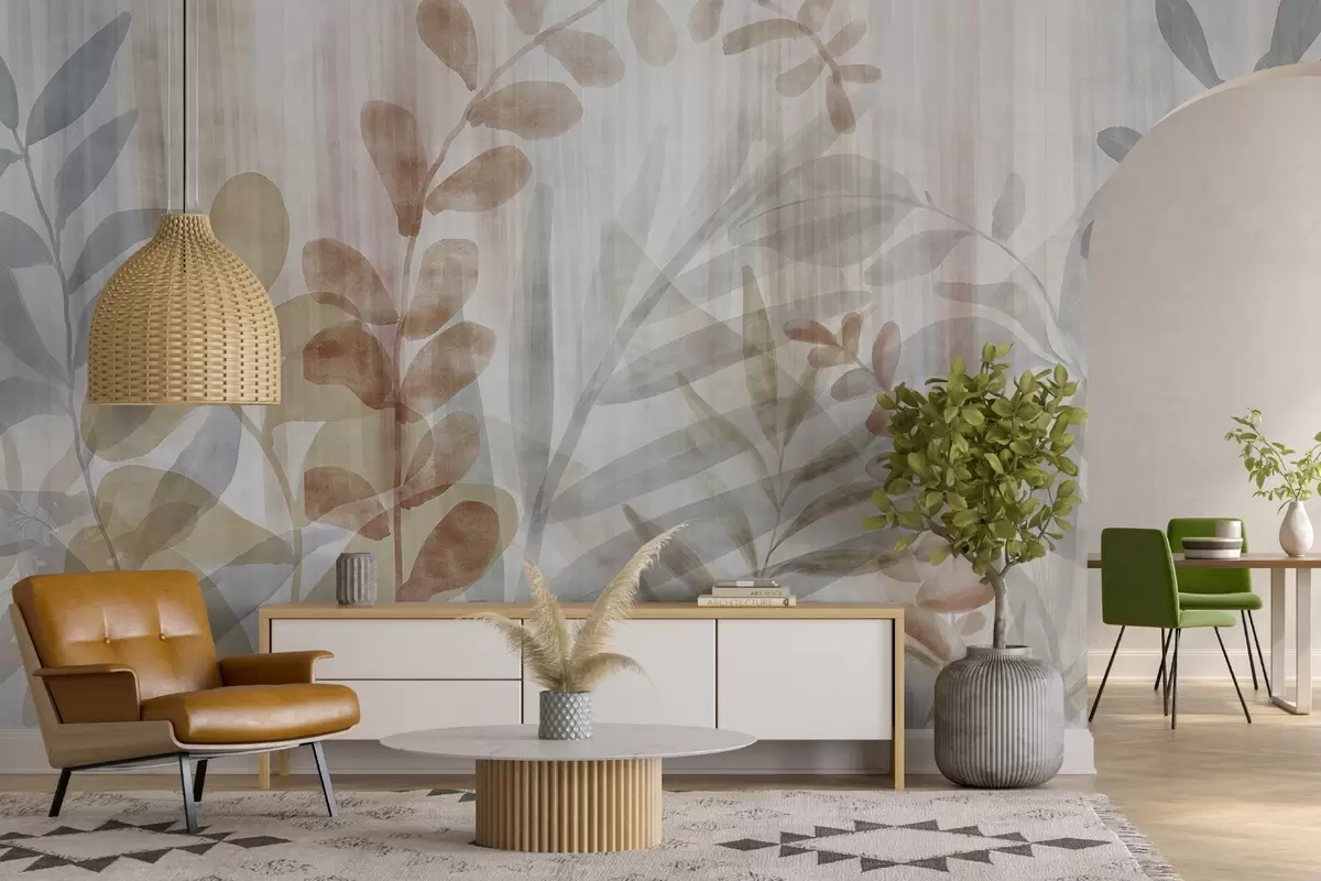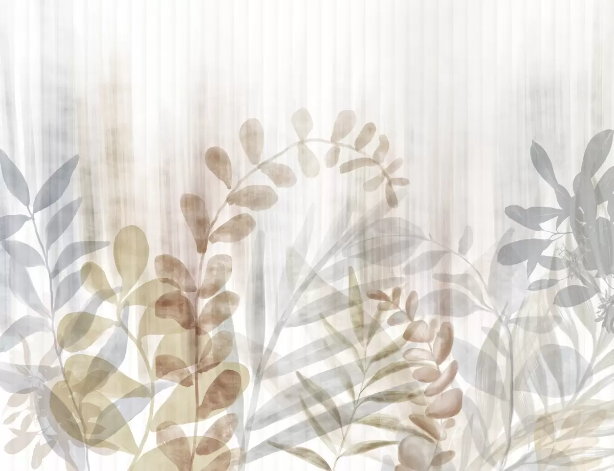 Fototapety Akvarelová malba imitující rostliny s různobarevnými tlumenými listy, světlé pozadí se svislými liniemi, botanická ilustrace Č. w09146
