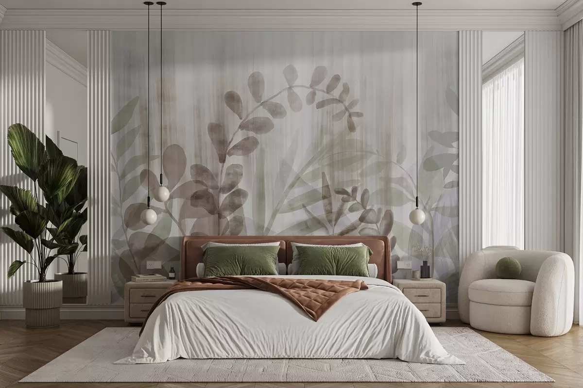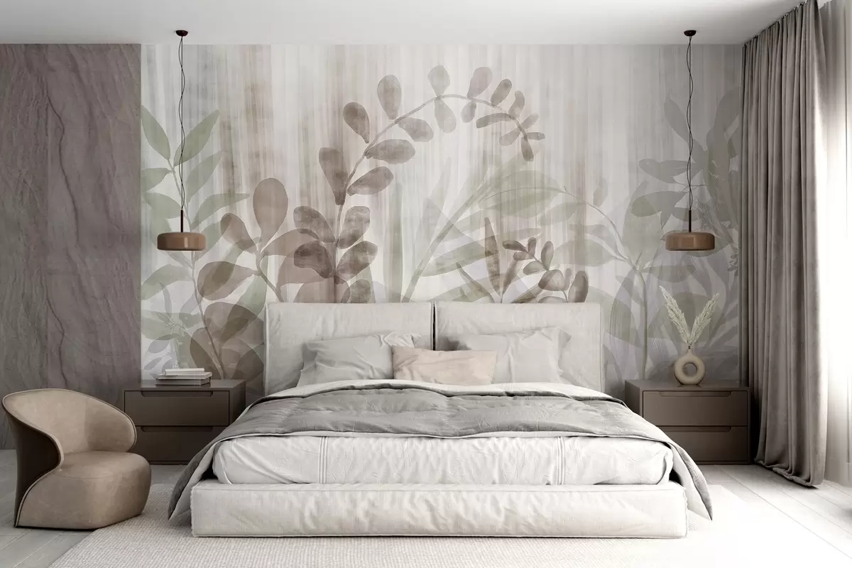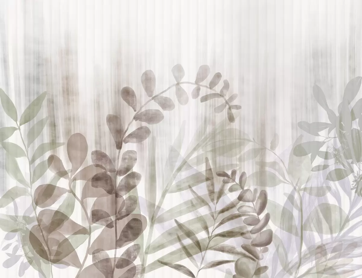 Fototapety Akvarelová malba imitující rostliny s různobarevnými tlumenými listy, světlé pozadí se svislými liniemi, botanická ilustrace Č. w09146v1