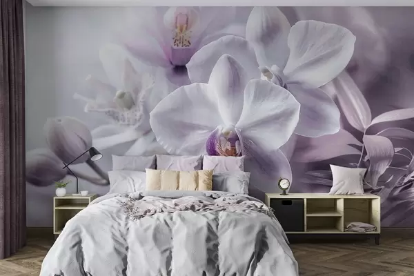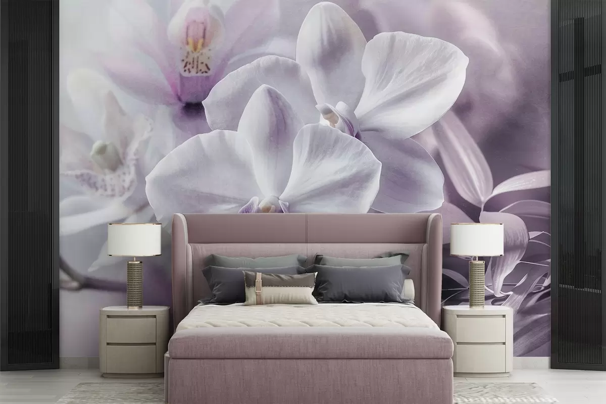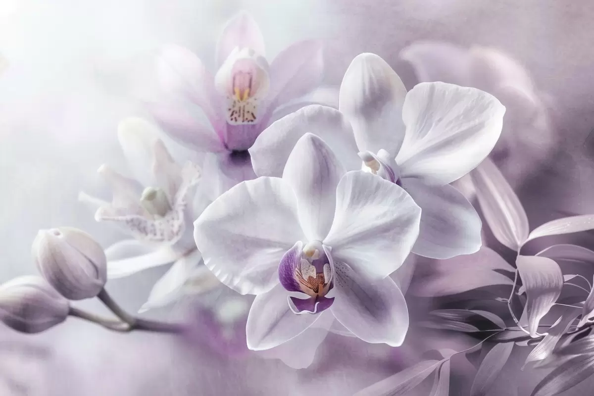 Fototapety Bílé a lila jemné květy orchidejí, měkké osvětlení a rozmazané texturované pozadí Č. w09155