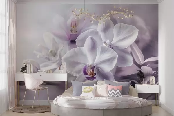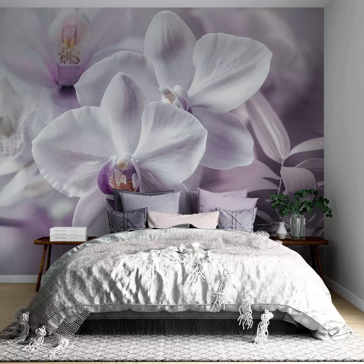 Fototapety Bílé a lila jemné květy orchidejí, měkké osvětlení a rozmazané texturované pozadí Č. w09155