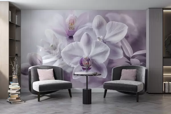 Fototapety Bílé a lila jemné květy orchidejí, měkké osvětlení a rozmazané texturované pozadí Č. w09155