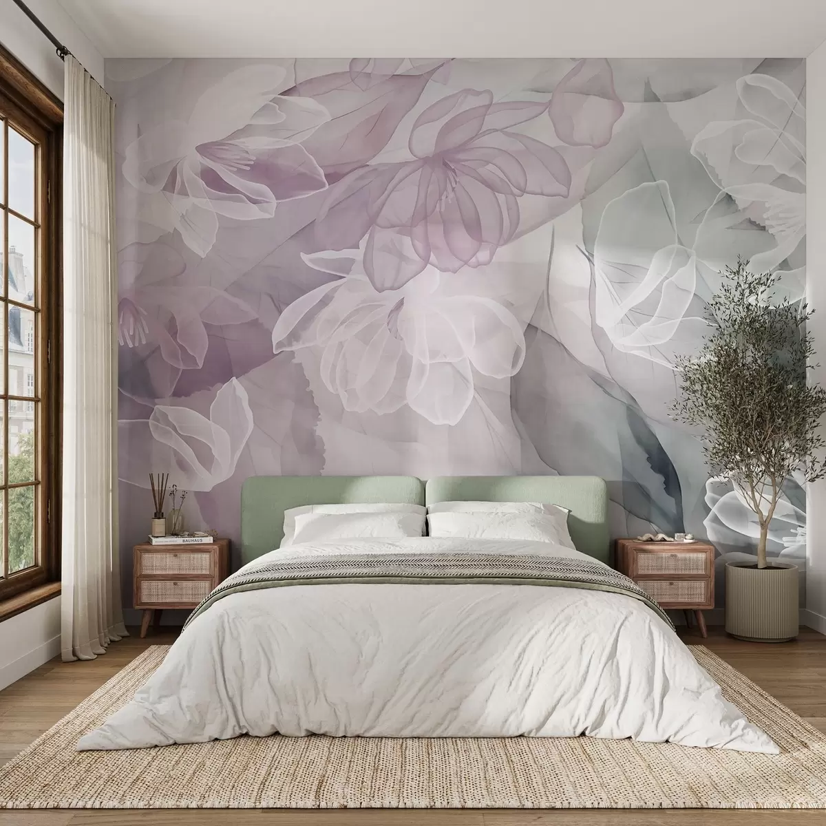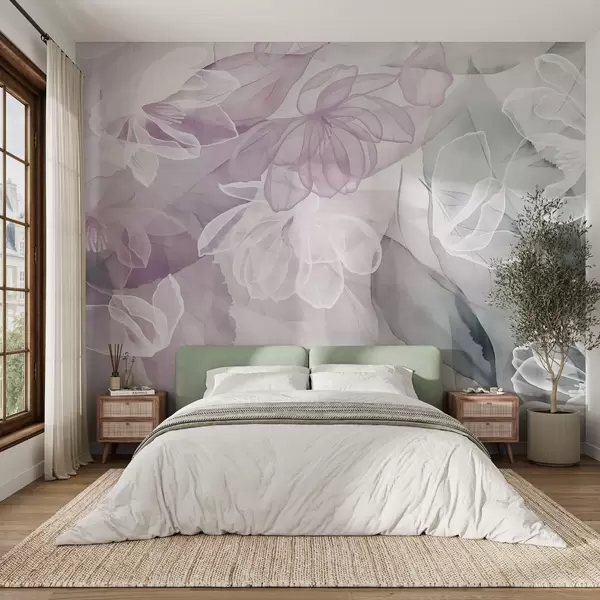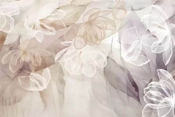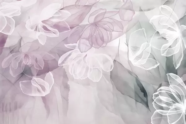 Fototapet Květy a listy s průhlednými okvětními lístky v odstínech bílé, růžové a zelené, měkké a jemné w09158v1