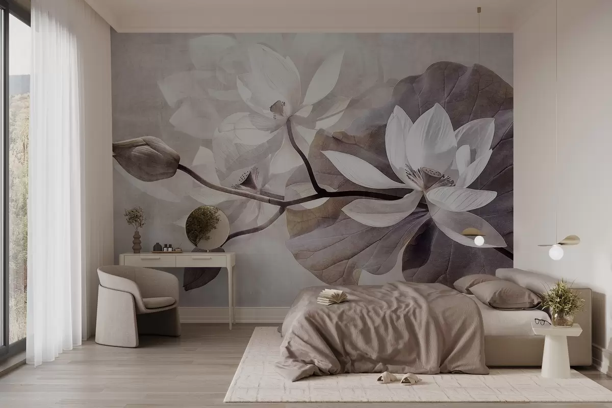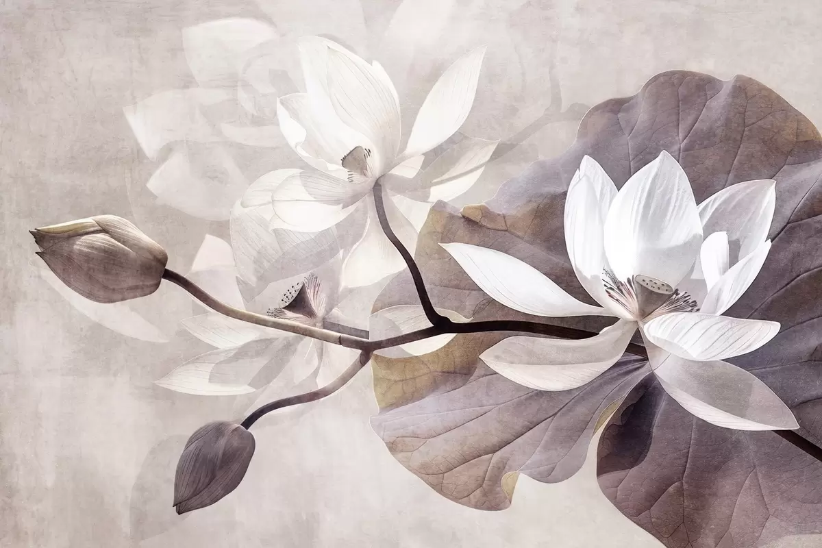 Fototapety Zrnitá textura tlumených jemných lotosových květů s listy a stonky v jemné béžové barevné paletě Č. w09159
