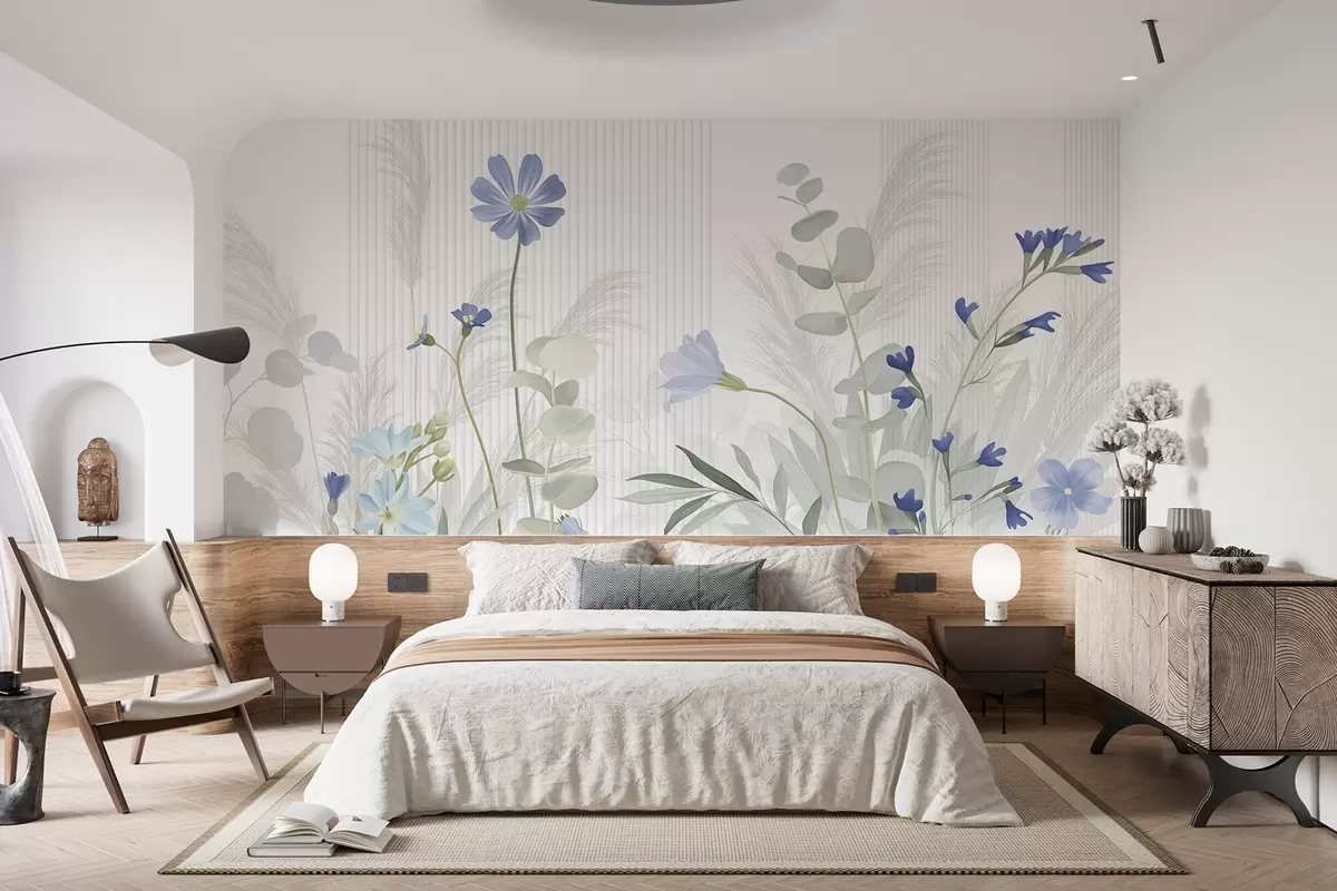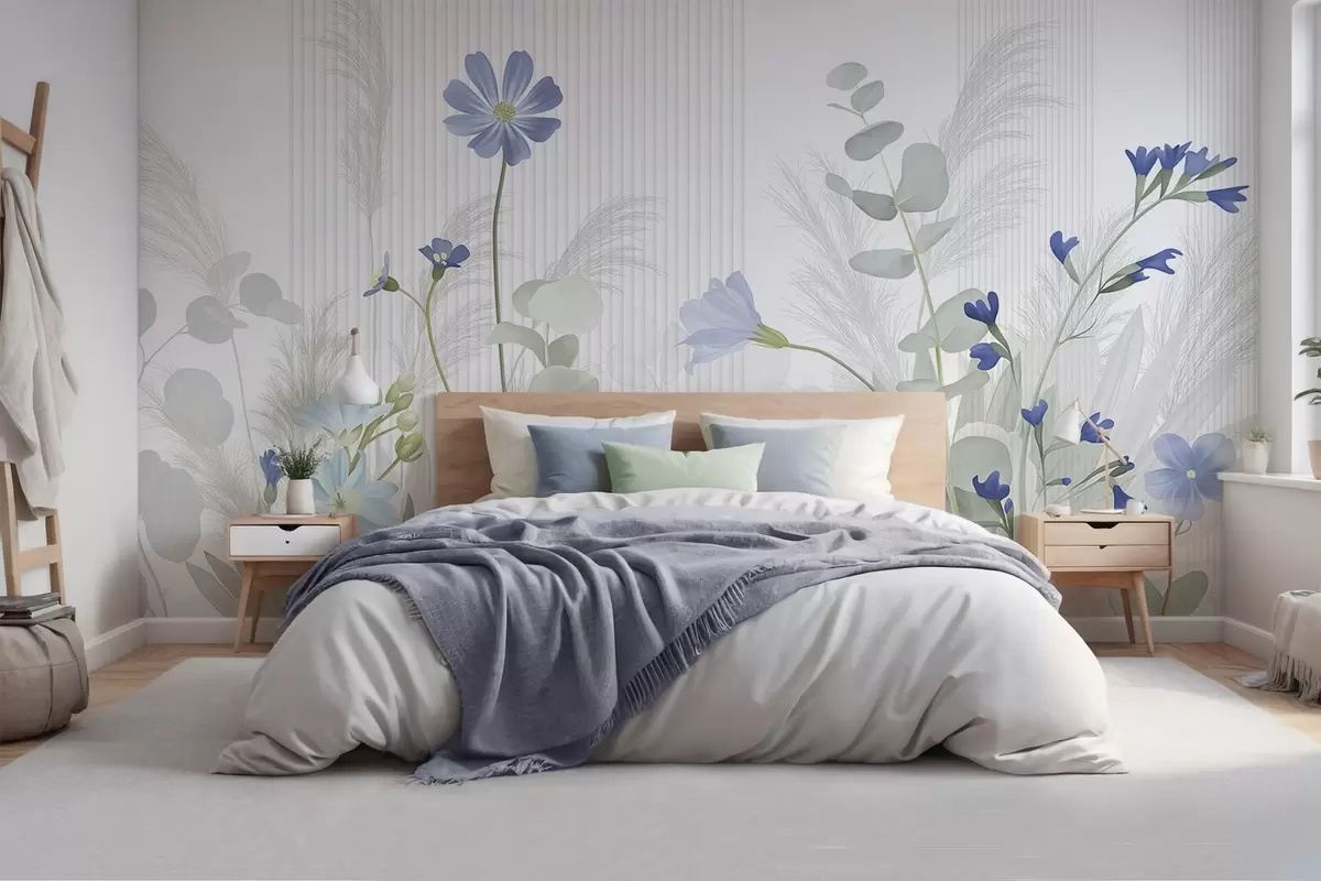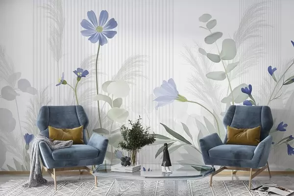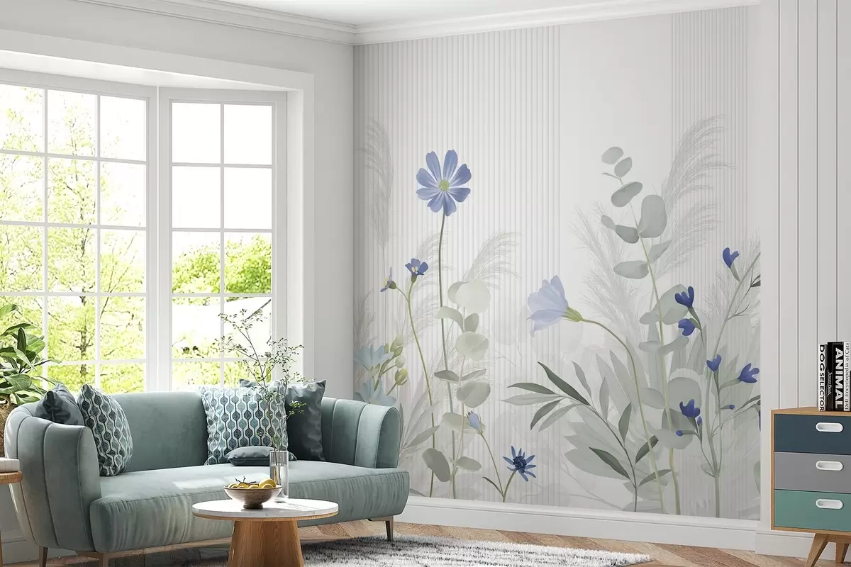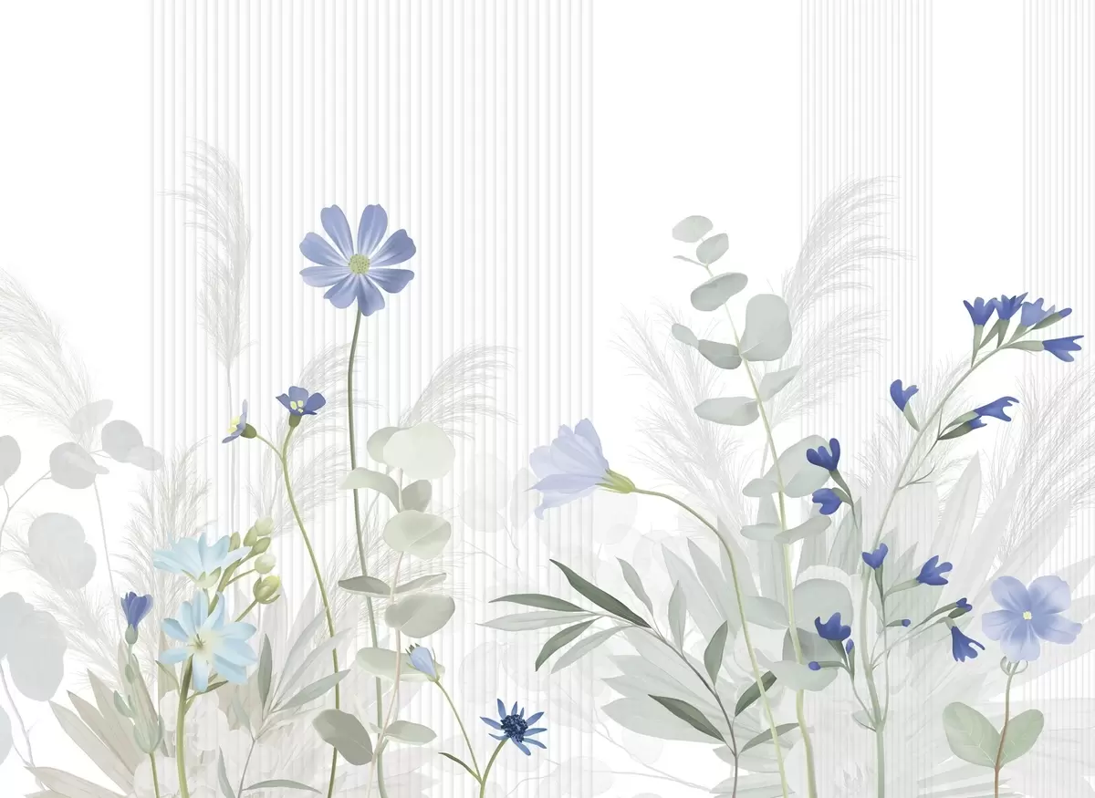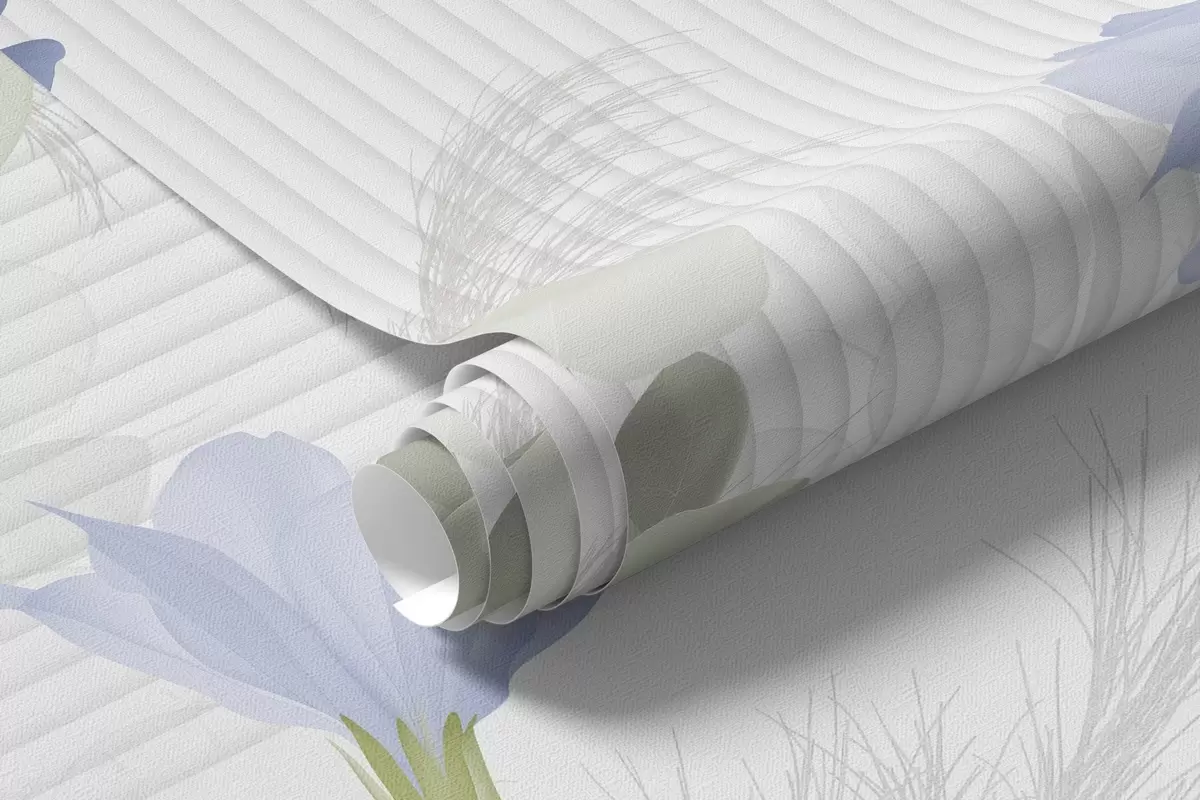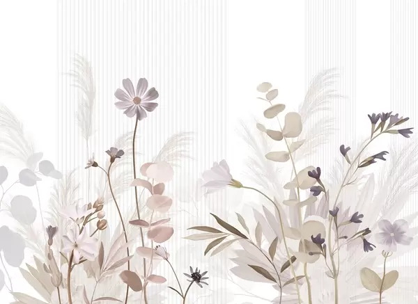 Fototapety Květiny v pastelových barvách, světle zelené listy, bílé pozadí se svislými liniemi, elegantní a minimalistické Č. w09161v1