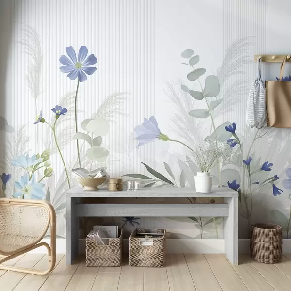 Fototapety Květiny v pastelových barvách, světle zelené listy, bílé pozadí se svislými liniemi, elegantní a minimalistické Č. w09161v1