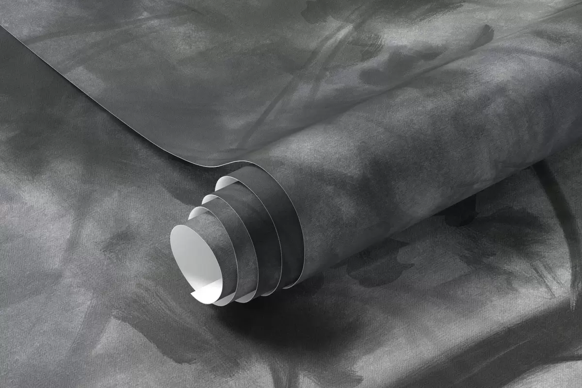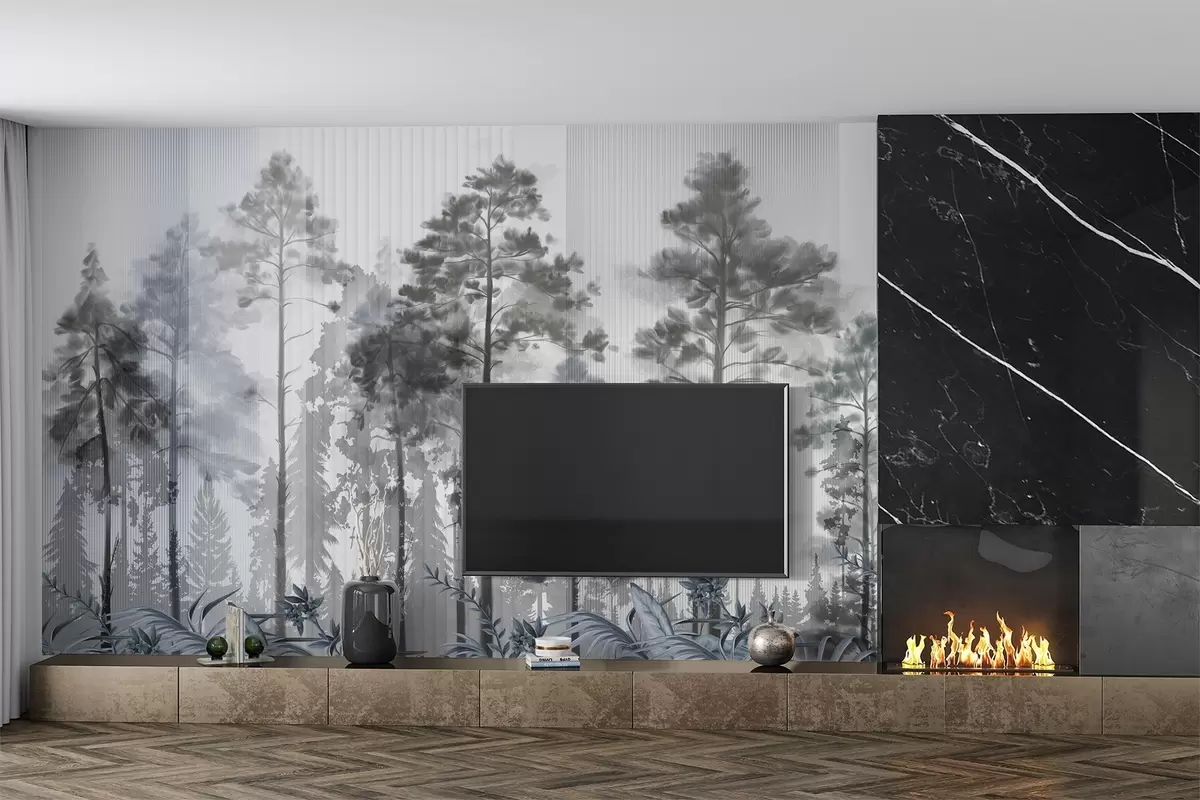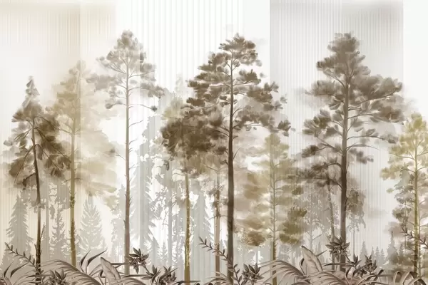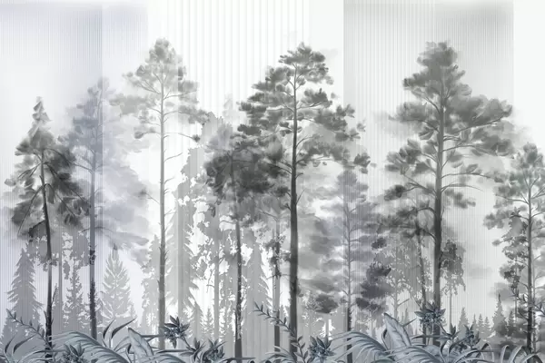 Fototapety Hustý les s vysokými borovicemi, svěží šedé listí, mlhavá atmosféra s vertikálními liniemi Č. w09163v2